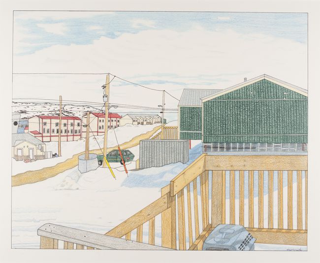 Padloo Samayualie, Untitled (Scene from Cape Dorset from a porch with an animal carrier on landing), 2015. Coloured pencil, graphite on paper, 58.4 x 76.2 cm. Collection of the Winnipeg Art Gallery, Gift of Marnie Schreiber, 2019-89 © Padloo Samayualie. Photo: Serge Gumenyuk, courtesy of the Winnipeg Art Gallery