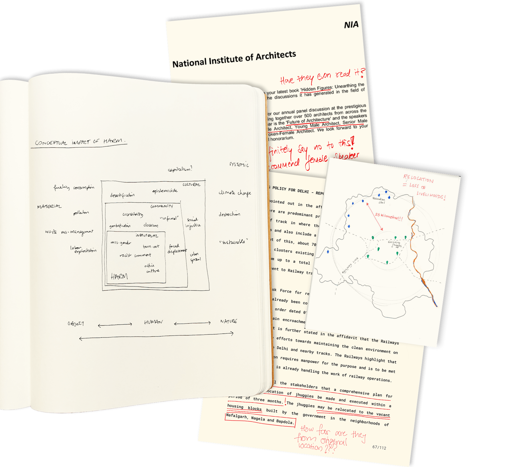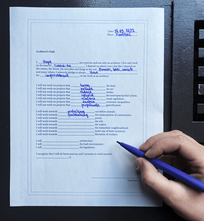 These diaries were made in about a hundred hours over three weeks, two online and one in Montreal, which produced one hundred and nine pages of notes with over forty thousand words. It was all possible only because of the dedication of the participants and the generosity of the interviewees: Elizabeth Timme & Chazandra Kern (Office of: office), Astrid Smitham & Nicholas Lobo-Brennan (Apparata), Guujaaw, Cristina Gamboa (Lacol), Menna Agha, Sename Koffi Agbodjinou, Andrew Daley (Architecture Workers United & The Machinists Union), Jess Myers (RISD), Kaya Lazarini and Giovana Martino (Usina CTAH), Andreas Malm. We are deeply grateful to them.