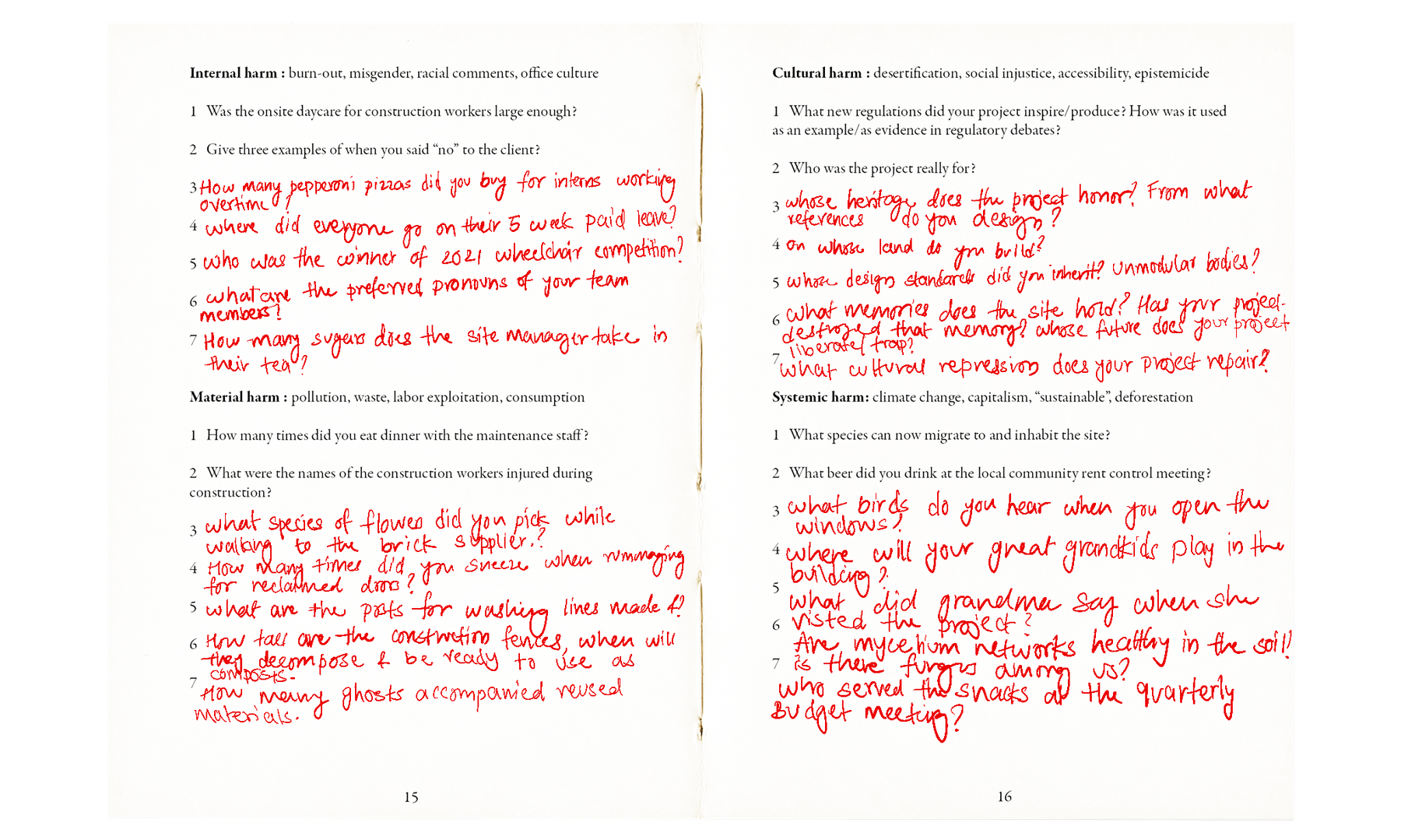 We’ve added other resistance questions. “Where will your great grandkids play in the building?” has helped us consider the longevity of our buildings while “What birds do you hear when you open the windows?” has helped us understand the broader ecologies into which we insert ourselves. Individual architects have also developed their own resistance questions that include “Give three examples of when you recently said ‘no’ to the client” or “Whose design standards did you inherit?” Recently these resistance questions have been formulated by Critical Practice into a Harm Assessment Guide that is being shared through a cooperation with the The Council for Architectural Repair and Ethics.