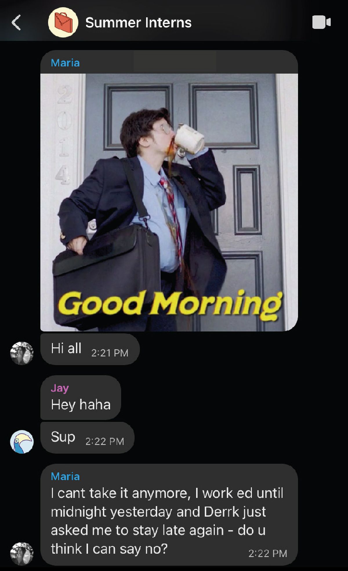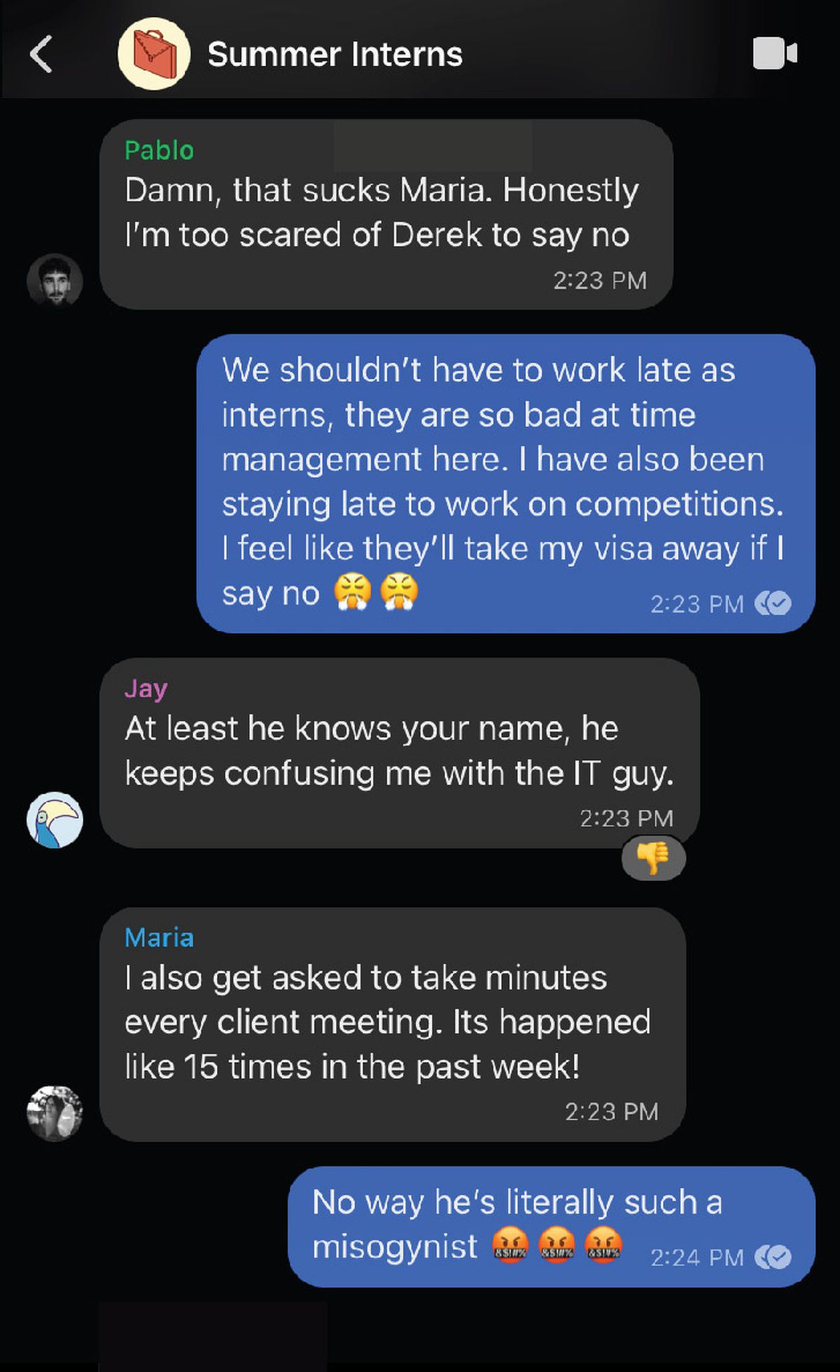 Ugh, Derek called Jay the name of another Indian guy at work. I didn’t know what to do, so I just walked away, but now I feel ashamed. It’s like that time when Derek told Maria to take the meeting minutes when she was the only woman there. When she told me, she seemed really upset, but she couldn’t say no, so she just did it. I didn’t feel like I could say anything.
