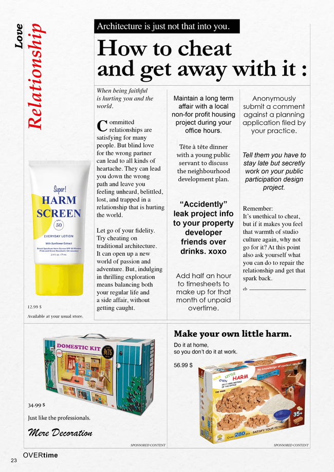 Since 2018, the CCA’s annual “How to” residency has produced interventions in para-architectural activities like publishing (How to: not make an architecture magazine), curation (How to: disturb the public), and awards (How to: reward and punish). The residency was conceived as a platform for rapid tool-making in res ponse to specific opportunities and needs, and in 2022 it begins a new three-year cycle focused on accelerating changes in architecture practice, beginning with architect hybrids (How to: not become a developer).