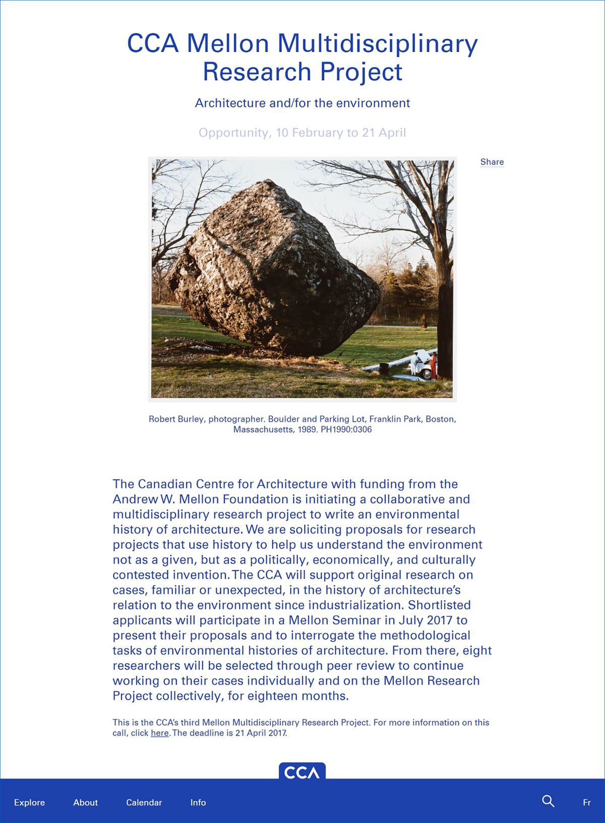 The environment, more specifically what practitioners, historians, and theorists of architecture understand by that term, is in flux—its definition is contested and expanded as society’s relationship with nature changes. Based on an open call launched in 2017—a moment when the wholesale modification of the Earth was becoming undeniable—the CCA began working with a group of researchers on a multidisciplinary research project sponsored by the Andrew W. Mellon Foundation’s Architecture, Urbanism, and the Humanities-Initiative. Over the course of eighteen-months, the team interrogated what it means to write an environmental history, or rather multiple environmental histories, of architecture.