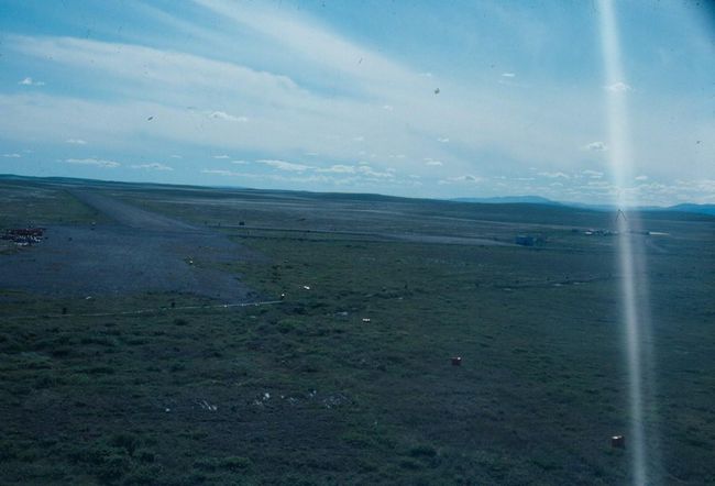 Old graves at the west end of the airstrip at the Shingle Point DEW Line, 19 July 1991. We can see the airstrip in the background, along with a few buildings. Photographer: Murielle Nagy. Source: Inuvialuit Cultural Centre Digital Library, https://inuvialuitdigitiallibrary/show/2738