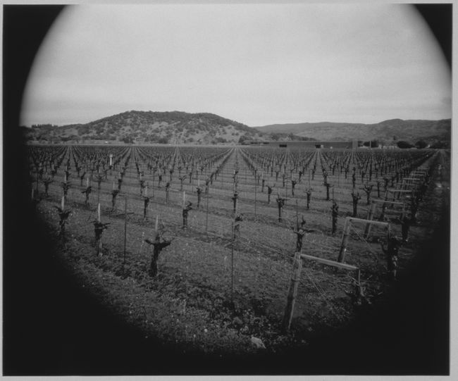 - The CCA commissioned the photo in 1996 or 1997. They were interested in the architecture of the winery and thought I could do something interesting. My process was very simple. People have the impression that everything I do involves some elaborate, artificial process. In this case, I went to Napa with my 8 × 10 camera, found the right place for the picture, and photographed the scene for two or three days. I decided to visit in winter because it seemed like the vineyards would be more striking without the cover of foliage—you could better see the fields’ layout and the geometry of their perspective. As usual in my work, I aimed to produce one picture that would sum up something about the relationship of the building to the land, wine, and seasons.