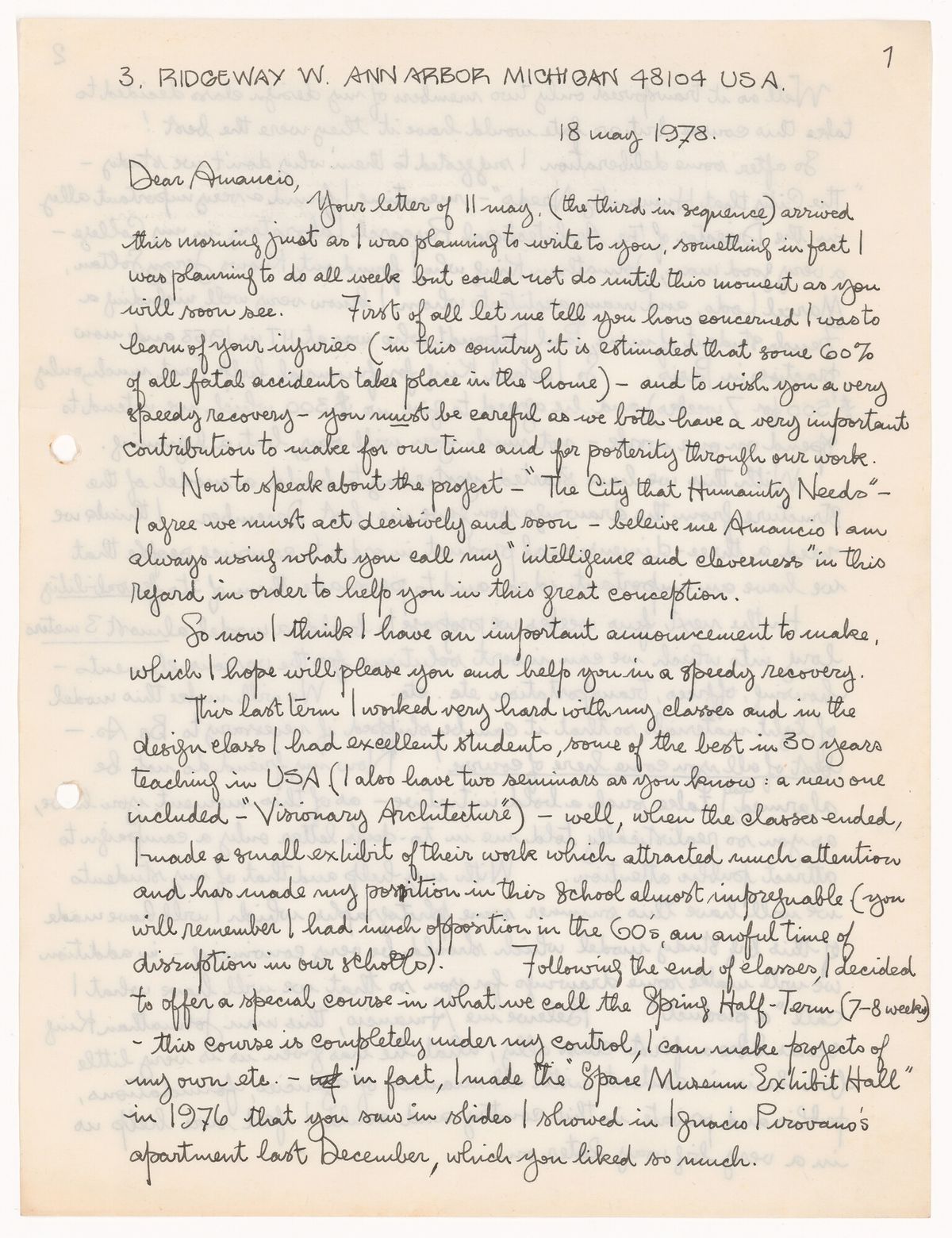 Hay un momento en la correspondencia con Malcolmson sobre cómo tendría que ser ese proyecto de largo alcance que va a ir en llamando La ciudad que necesita la humanidad en que le dice “Bueno, hay que seguir adelante, empecemos por tratar de construir pequeñas cosas”. Y, entre otras cosas, Malcolmson va a organizar al final de la década de 1970 un taller con sus estudiantes durante el cual finalmente va a construir un modelo de esta ciudad para el cual Amancio envía muchos croquis preliminares y para los cuales va a utilizar mecanismos de collage para componer y pensar su proyecto, y para mostrarlo. Hay un trabajo artístico que creo que está en la base de su pensamiento arquitectónico y que está ligado a algo que en las cartas repite una y otra vez, que es la idea de la pureza y la belleza de la forma. Esa es una frase que uno encuentra como si fuese uno de sus objetivos finales, que por supuesto uno lo puede ver desde muy temprano en la propia Casa sobre el arroyo, pero es un presupuesto de simpleza y belleza formal que él entiende es parte también del tipo de ambiente que necesita la humanidad.