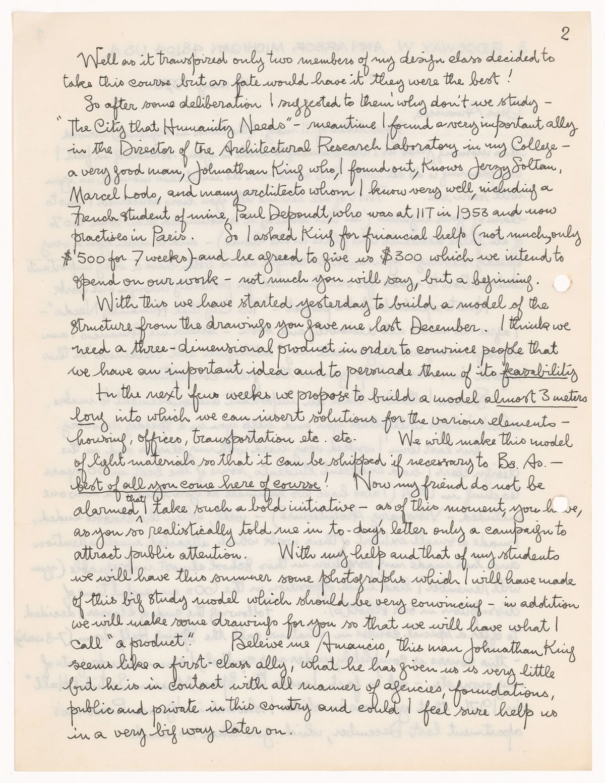 Todo este esfuerzo enorme de difusión de su persona, pero en el fondo, también de sus ideas sobre la ciudad, tenía como objetivo tratar de mostrar nuevos modos de vida y la imperiosa necesidad de vivienda, y por lo tanto de su organización en ciudades de alta densidad, que era el gran tema entre los arquitectos modernos y algo que va a estar siempre en el corazón de su pensamiento y de su obra. Y eso es muy notable en sus cartas. Hacia los finales de la década de 1950 se inicia su correspondencia con Reginald Malcolmson, una persona realmente extraordinaria en cuanto al feedback que va a ofrecer durante más de veinte años respecto a una idea que Williams comenzó llamando las Viviendas en el espacio, un prototipo bastante tradicional de viviendas concebidas para poderse hacer en cantidad, con criterios saludables y según todos los presupuestos del modernismo, pero que va a virar a un proyecto que le va a llamar La ciudad que necesita la humanidad. Esa grandilocuencia del nombre va a ser tema de conversación en la correspondencia con Malcolmson, quien en algún momento le dice “primero difundamos la idea, después vamos a ver si el nombre es el adecuado; necesitamos convencer a la gente para que los políticos se convenzan y así podamos construir esa ciudad”.
