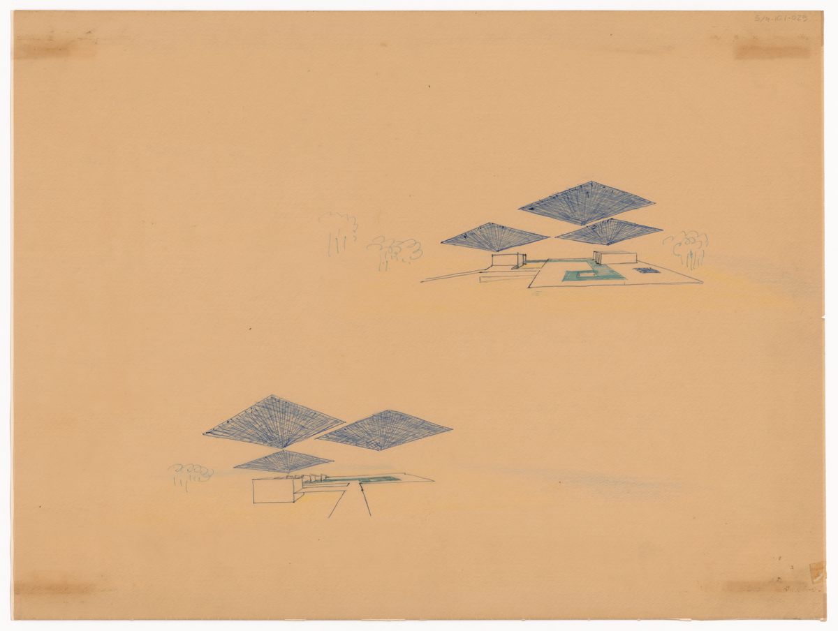 - But I think of that as very valuable, because many times, architects are expected to constantly think of new ideas. Amancio achieved a lot of recognition for the Casa sobre el arroyo very early in his career, so maybe that also gave him either the confidence or the anxiety to pursue a career that was based on those initial ideas. In looking at drawings, there is the process material, and there is the very finished or more technical material, but there is also some highly abstract material. It’s almost like he used the aesthetic of a logo to synthesize his gestures that then he could apply into many different projects. It could go from the scale of the domestic to the scale of a hospital, or a gas station, or a supermarket.