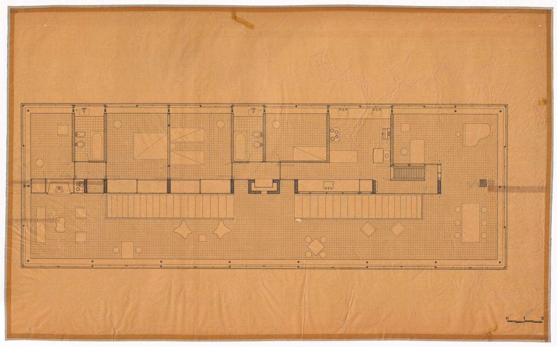 - The archive is, in a way, a panoramic overview of that production that includes not only different phases of the project, going from an idea to the execution, but also the intermediate phase in which there are some drawings that are preparations for other drawings. There are rolls of hundreds of drawings that were used to inform not only construction, but also presentation drawings. The collection includes that diverse range of possibilities. Preliminary drawings, intermediate stage drawings, final drawings. It allows you to see the mental process of this architect thinking through drawing, thinking through making. And that somehow tedious translation of one scale to another, or from one project to another, or from one detail within the same building into another detail. It’s a very complete exercise.