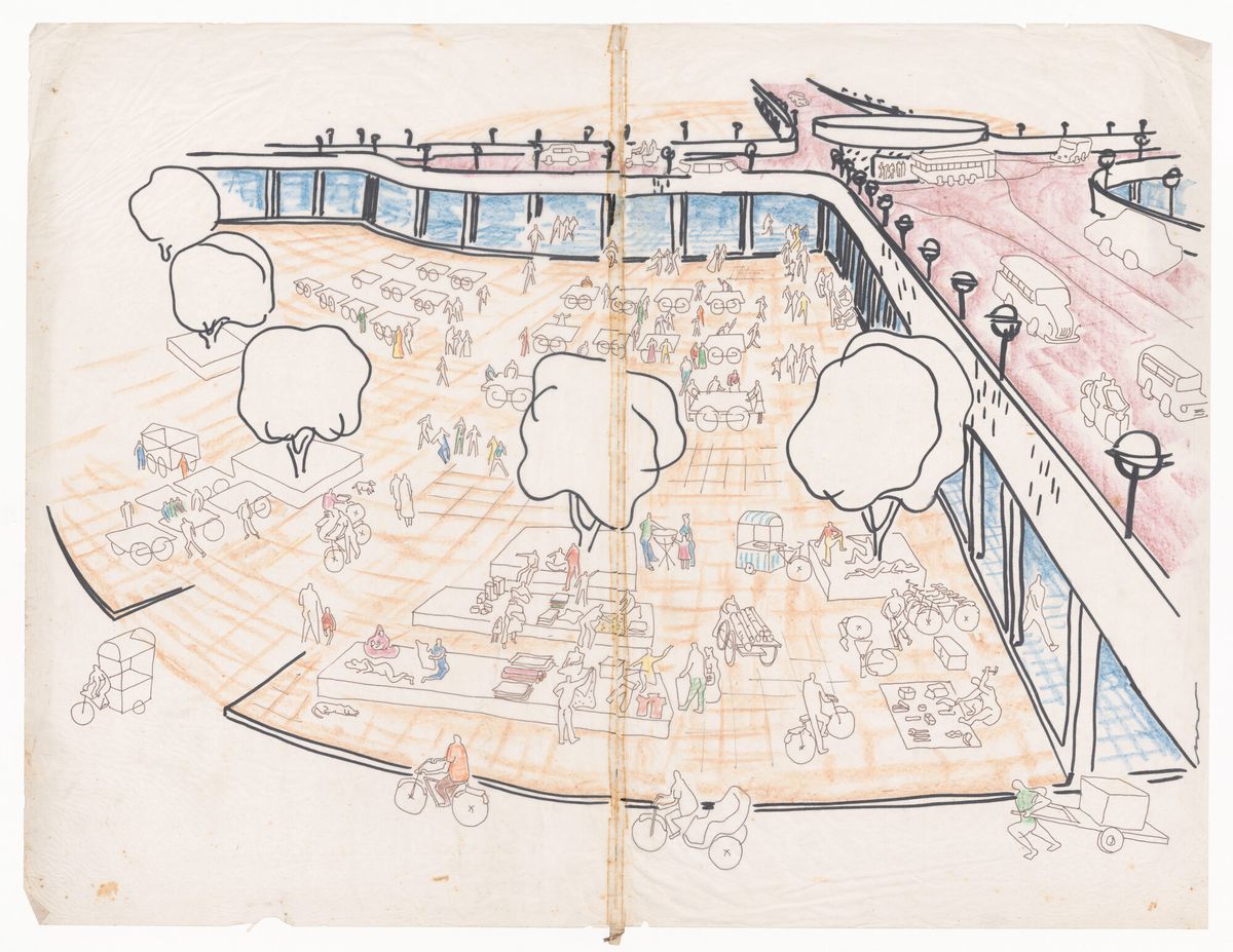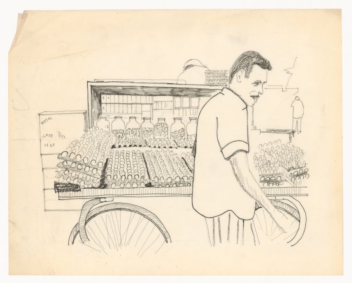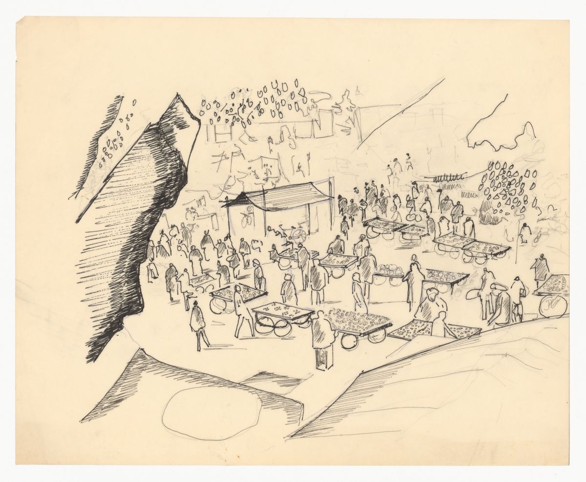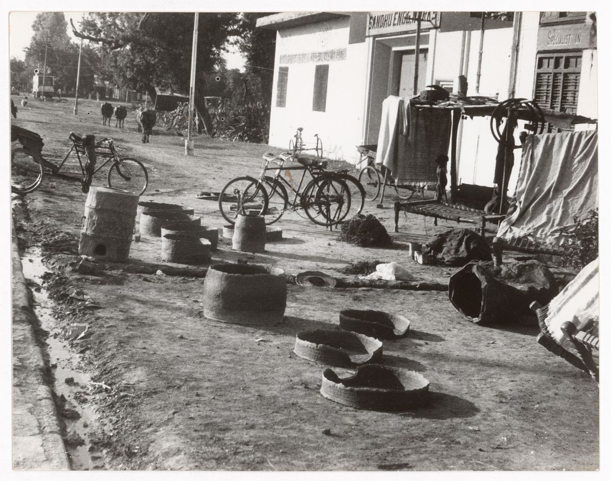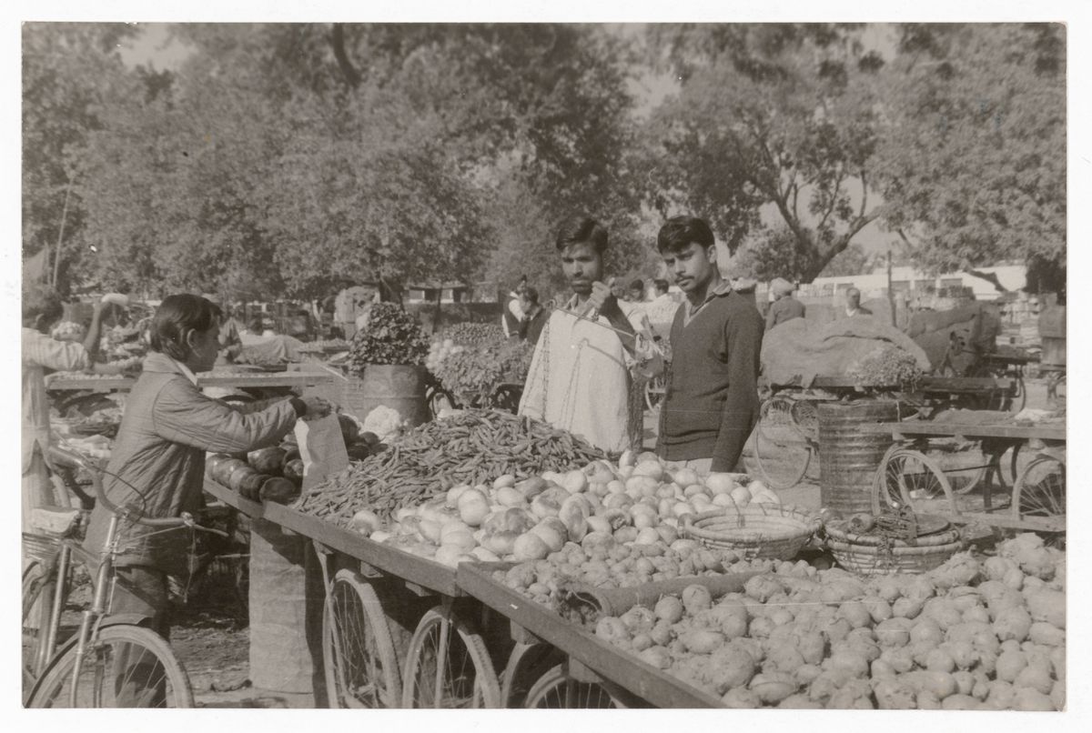 Aditya Prakash advocated for principles of planning that we now understand under the banner of “sustainability,” like recycling, integration of the informal economy, bringing agriculture and animals into urban spaces, and rigorously separating motorized and non-motorized traffic, which he referred to as “lethal” and “non-lethal” transport. Prakash took hundreds of photographs that dwell on this ecosystem, namely, the relentless interface of the village/urban relationship as it expressed itself throughout the region. Cattle, street-hawkers, squalor, and village-life are painstakingly recorded in these photos, but not because Prakash viewed these experiences as somehow at odds with modernist urban planning. Rather, he was interested in how such rural lifeways became enmeshed with urban design in India. Prakash’s ambitious conception of the Linear City, an urban model comprised of a uniform grid with elevated road networks, and his preoccupation with the rehri (the wooden cart belonging to a street vendor, or rehri-wallah), were both efforts to bring the so-called formal and informal spaces and economies into a single integrated urban vision.