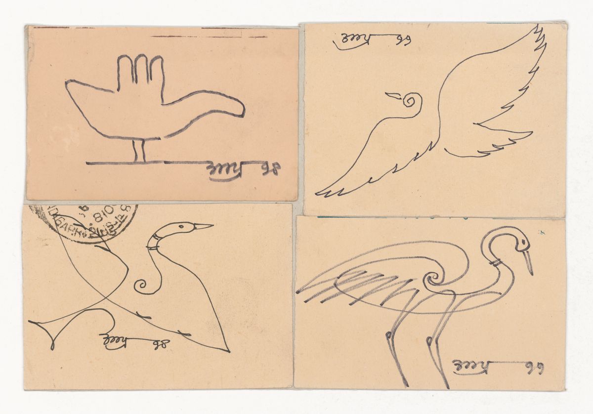 Such an ecological vision of sustainable integration is equally present in Prakash’s paintings and drawings, especially from the 1990s on. By that time, he had retired from architecture and turned to painting full-time for the last eighteen years of his life. He had his first solo exhibition at the Taj Gallery in Bombay in 1989, just before a series of economic reforms in the 1990s would replace the socialist vision of the Nehruvian era, laying the groundwork for the globalized conditions we inhabit today. The exhibition featured twenty works depicting mythic forms from the organic world, mostly animals including birds in flight, bulls, swans, and peacocks. This naturalist subject matter was nonetheless calibrated through a distinctly modernist and geometric approach to line, form, and colour. “If the environment is healthy, delightful, and worth preserving then the value lies in discovering the form that fascinates,” he explained in his artist statement for the show. The goal was to “let the viewer feel that life is worth living in the lap of nature.” The archive contains correspondence from this final chapter of Prakash’s career with many luminaries from the Indian art world—including the legendary gallerist Kekoo Gandhy, the great dramatist, Ebrahim Alkazi, and major painters like Tyeb Mehta and Gieve Patel. Prakash’s life-long pursuit of a more harmonious relationship between our urban systems and the earth’s organic environment, sustained across his architectural, design, and artistic practice in different ways, prefigures a kind of ecological consciousness that is more urgent today than ever before.