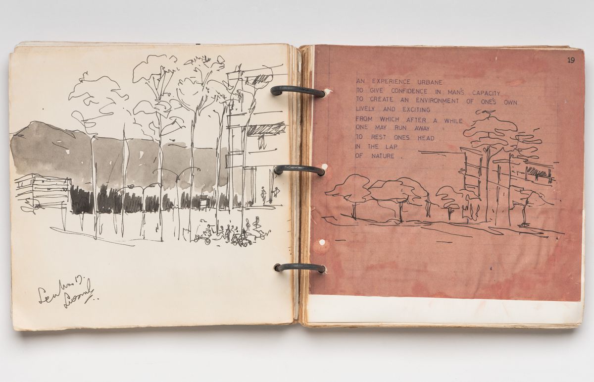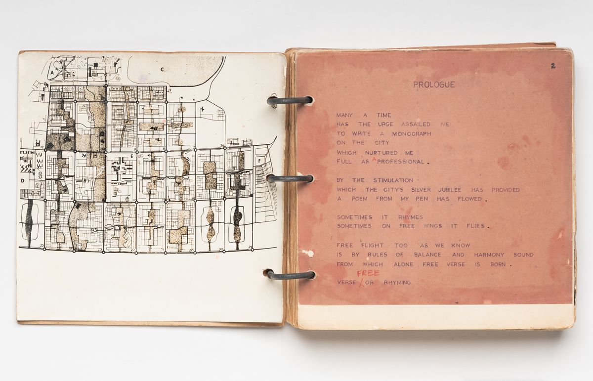 Conveniently for researchers, the Aditya Prakash fonds at the CCA exists alongside the Pierre Jeanneret fonds and the two archives are superb complements to one another. Jeanneret served as Chandigarh’s chief architect from 1952 to 1965 and his archive contains more extensive documentation about the Capitol Project than Prakash’s. This is because for Prakash, the building of Chandigarh marked the beginning of a journey rather than an end. Prakash’s archive reflects, by contrast, a longer intellectual odyssey spanning six decades of a relentlessly creative life. A painter, playwright, actor, photographer, designer, poet, researcher, and writer, Prakash was a man with seemingly inexhaustible creative energy. The materials in the archive span a range of unexpected and sometimes quirky forms, and include drawings, doodles, diaries, poetry, photographs, scrapbooks, letters, postcards, greeting cards, theatre scripts, and furniture and set designs, to name a few. Compellingly, the method of drawing with a single continuous line appears consistently throughout Prakash’s sketches and designs. This technique—which resonates metaphorically with the idea of intellectual activity sustained over the arc of a lifetime—thus became the title of Vikramaditya Prakash’s book about his father’s work, One Continuous Line: Art, Architecture, and Urbanism of Aditya Prakash. This book by the younger Prakash, an architect and architectural historian who has written extensively on the city of Chandigarh, provides an invaluable overview of his father’s activities, and is an indispensable resource for navigating the fonds.