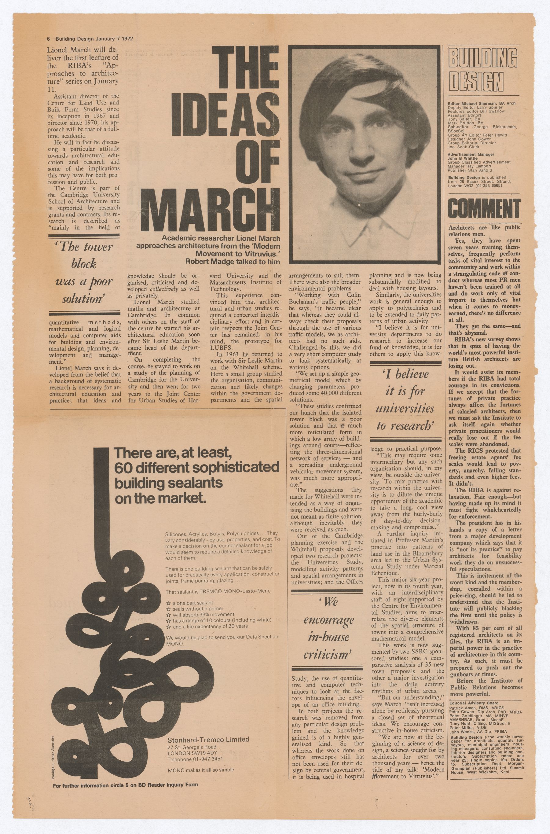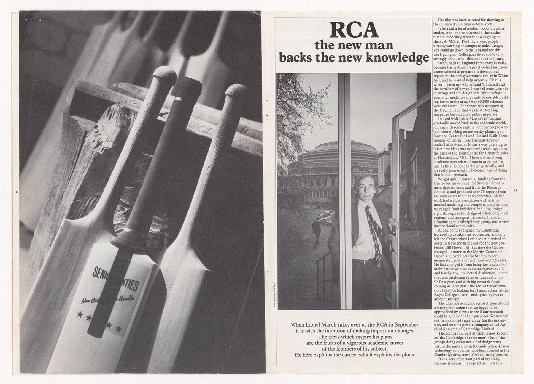 Lionel March was no stranger to the press. His vocal views about architectural education and research, planning and land use, and their politics, together with his headship of prominent research groups and institutions in British academia, enticed architectural and popular media. In the Lionel March fonds held at the CCA, we find documentation of this construction of his media persona. We discover typewritten drafts of a three-part BBC radio show on Frank Lloyd Wright—who March researched as a Harkness fellow from 1962-64—and democracy, that aired in January 1970.1 We encounter a full-page feature on “The Ideas of March” published in the architectural news magazine Building Design as a foretaste of his path-setting RIBA talk “Modern Movement to Vitruvius” in 1972.2 In the talk, March, who was director of the Centre for Land Use and Built Form Studies at the University of Cambridge at the time, declared mathematical models as heralds of a kindling, but long desired, scientific approach to architecture. In a series of folders, two of which March labeled “RCA Rake’s Progress,” we leaf through a collection of news articles about his tumultuous rectorship at the Royal College of Art (RCA), from his inauguration in fall 1981 to his resignation in 1983.3