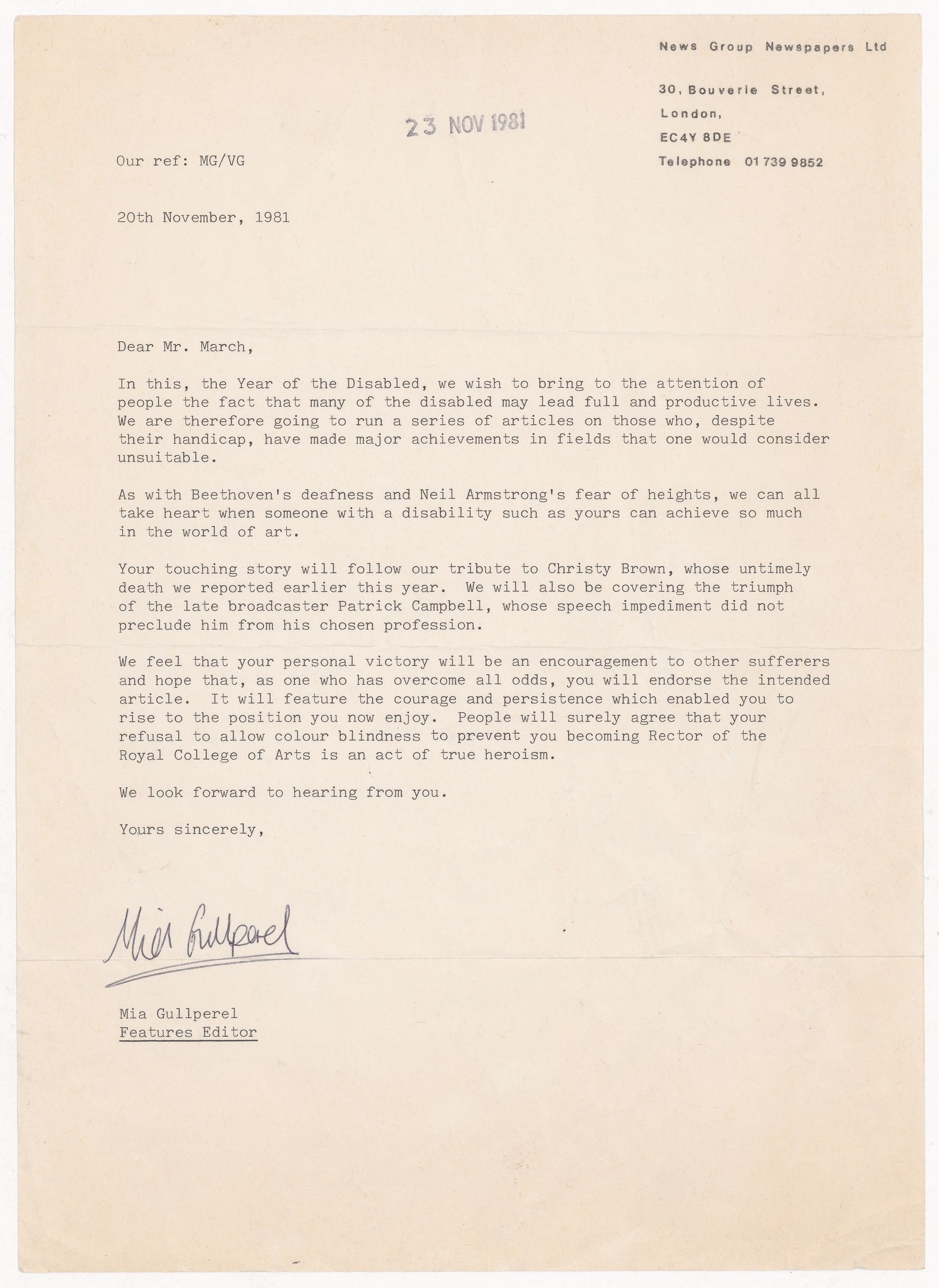 The RCA files are so many, and in multiples, that the odd single-page document may be easy to overlook—especially a likely unanswered letter that eludes the tantalizing storyline of institutional drama. I don’t think that March ever replied to the invitation by Mia Gullperel, Features Editor for the News Group Ltd.—the company that publishes the tabloid newspaper The Sun. There is no record of a response letter, no clipping to show for an article. “In this, the Year of the Disabled,” the letter begins, “we wish to bring to the attention of people the fact that many of the disabled may lead full and productive lives.” The invitation date, 20 November 1981, places it at the end of the International Year of Disabled Persons proclaimed by the United Nations General Assembly with the theme “Full Participation and Equality.” “As with Beethoven’s deafness and Neil Armstrong’s fear of heights,” the letter continues, “we can all take heart when someone with a disability such as yours can achieve so much in the world of art.” Rife in condescension, the letter is an exemplar of the “supercrip” stereotype, a term long-used by the disability community to describe, as Jessica Martucci writes, “the ways disability is often spun into sentimental narratives consumed as inspirational by the nondisabled.”1 We read about March’s “touching story,” his “overcoming of all odds,” his “act of true heroism” in becoming Rector of the RCA despite his disability. March, we learn if we endure and finish reading, was colour-blind.