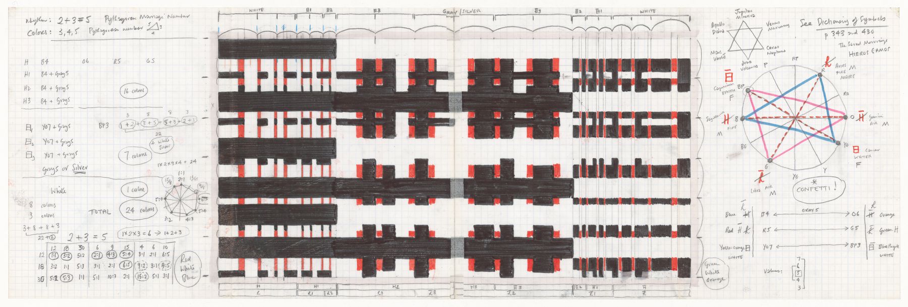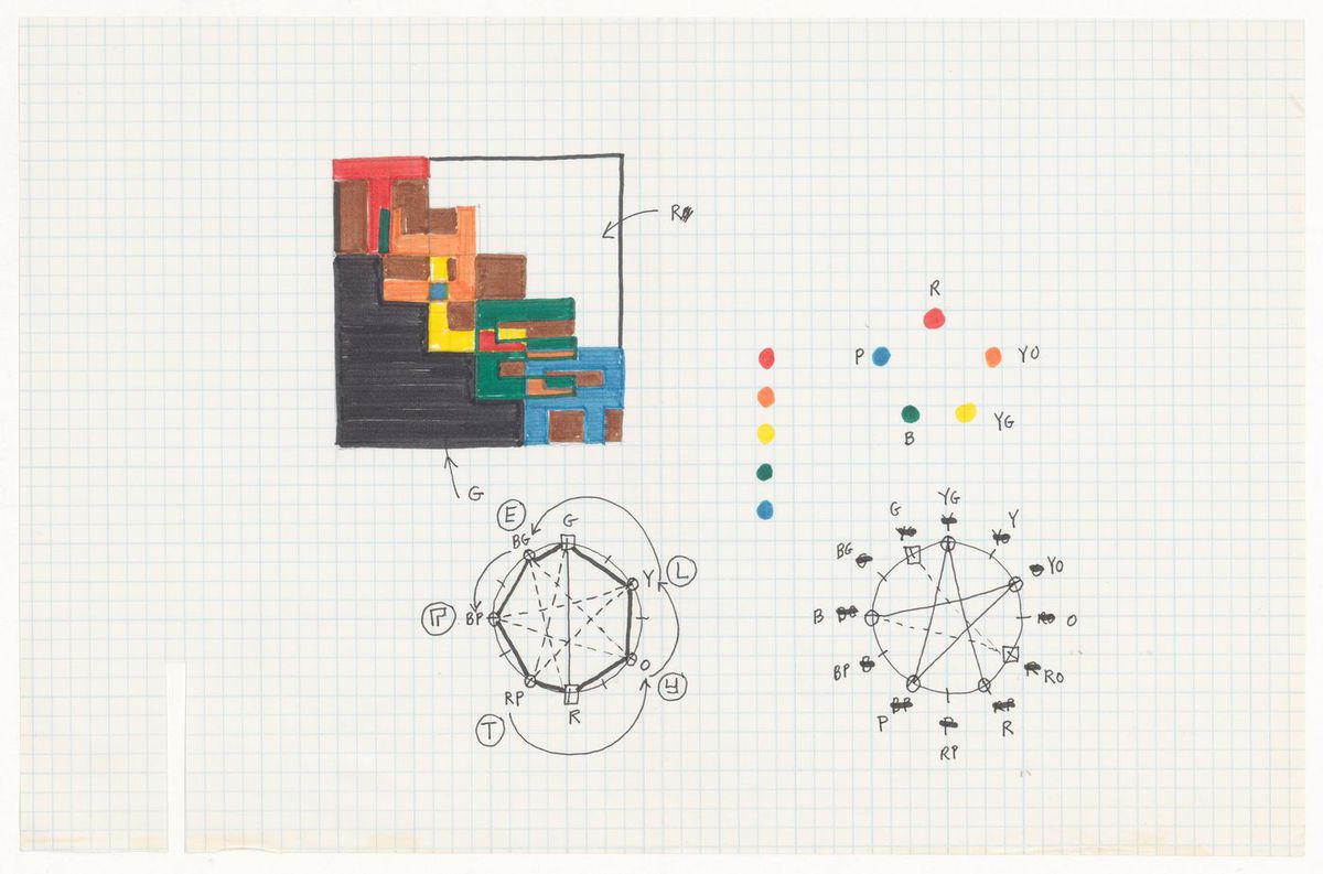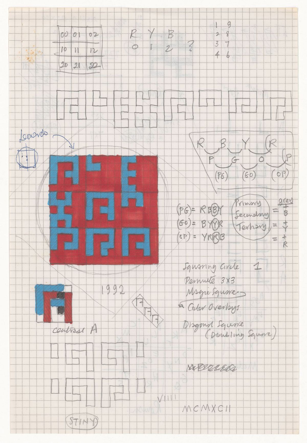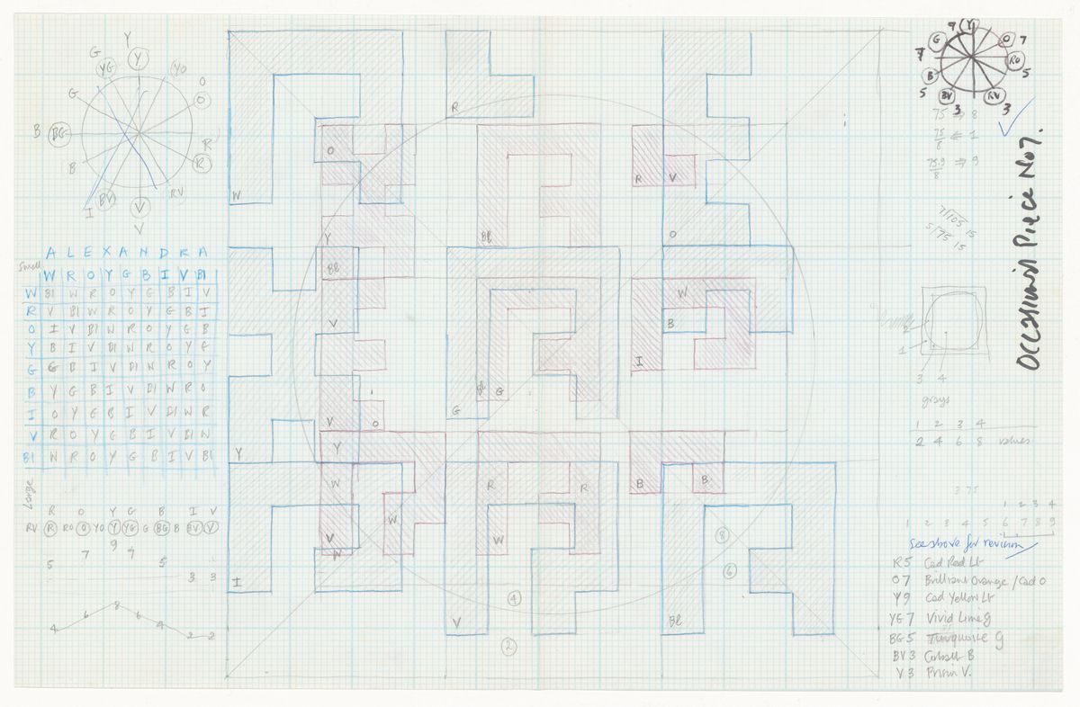 March’s paintings, results of a dedicated artistic practice that spanned decades, are not housed at the CCA. Yet the fonds includes a remarkable collection of the written notes and graph paper sketches with which March planned his “Occasional Pieces.”1 Usually acrylic on canvas and mostly painted after his move to the United States West Coast in 1984, these paintings were made to mark occasions (birthdays, most often) and gifted to loved ones—his daughter Candida, his grandsons Sam and Tyler, Alexandra, daughter of close friends and shape grammar theorists George Stiny and Terry Knight, to name a few. Each piece was a meticulously planned overlay of typography—spelling the name of the giftee—and colour. March stylized the letters to fit on a grid, permutated and overlaid them to the brink of recognizability, and assigned colour to emerging areas based on intricate associations among number systems, numerological constructs (the magic square of Saturn), colour wheels (March was a reader of Newton’s Opticks), musical harmonies and symmetries (the Dorian scale), symbolic meanings (“2,” he writes, “the first even number is characteristically female”), and mythological references (from Hera to Osiris). A boggling game of analogies and mappings.