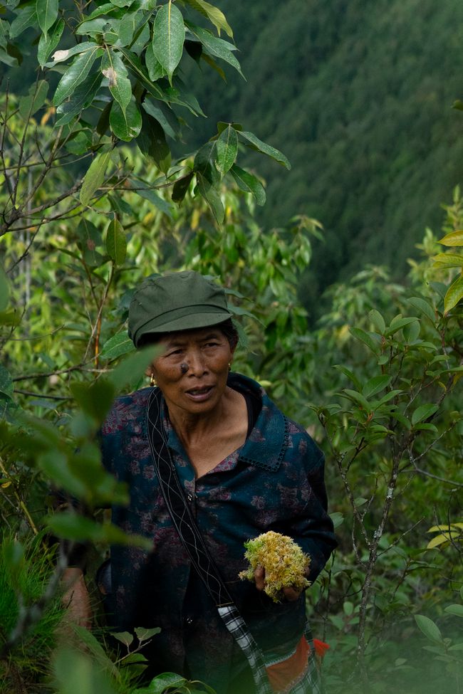 Merchants only come when villagers have gathered enough moss to make their journey across the trenches worthwhile. Over the past few years, the young buyer from the nearby village traversed high-altitude villages deep in Tibet and Nujiang, including Gongshan Derung and Nu Autonomous County, Fugong County, and the town of Liuku to collect the foraged moss with his small truck. Prices fluctuate constantly—sometimes 80 yuan per bag, sometimes 100 yuan.1 Once bags of moss fill the warehouse, out-of-province merchants collect them with larger trucks.