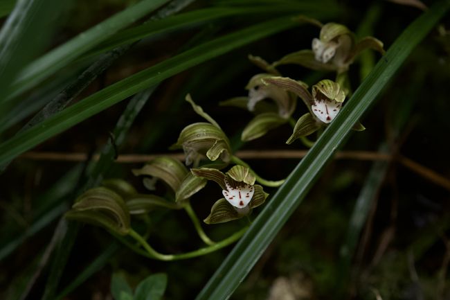 The path ahead was too dangerous—I could not reach the cliffs once again, stopping beside deadwood. At my eye level, this decaying wood displayed a vertical tapestry of life: Racopilum hugging the base, twist-tail moss spiralling upward, porella gleaming with waxy fronds, parmelia crumbling—each occupying its place. On the flatter surfaces, several Bulbophyllum orchids bloomed with tangerine-hued flowers. Perhaps these orchids could only overtake this deceased perch with the help of moss and lichen, which conserved the moisture and nutrients. This was where the aunties had gathered years before; now they ventured farther afield, allowing the moss to reclaim its plundered patches.