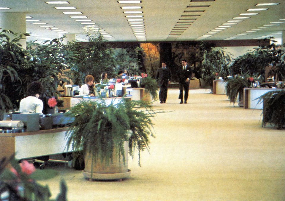 On the level of architecture, forest product companies and the US Forest Service promoted certain economies of construction, informed by demand curves and market conditions. Their close involvement with architecture can also be seen in the home bases of the companies: their central headquarters buildings. The Weyerhaeuser headquarters, designed by SOM, demonstrates in its curious design a new phase in the life of the corporation. The vast interiors blur the boundaries between architecture and forestry, precisely at the moment when the forest industry underwent a massive process of dematerialization in which “land” substituted “trees” as its main resource. This radical breaking point reorganized the workings of corporations geographically, politically and financially, and pushed artificial forests and their management to their next incarnation.