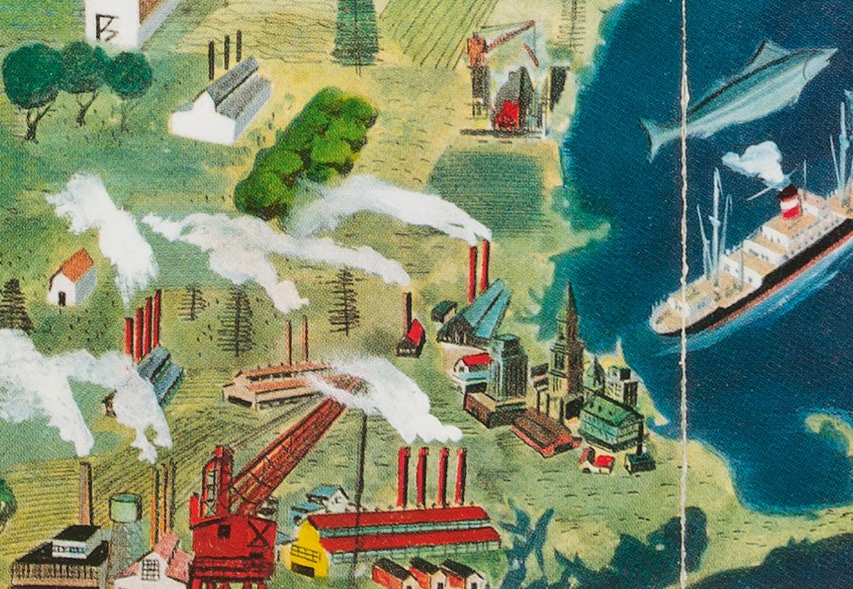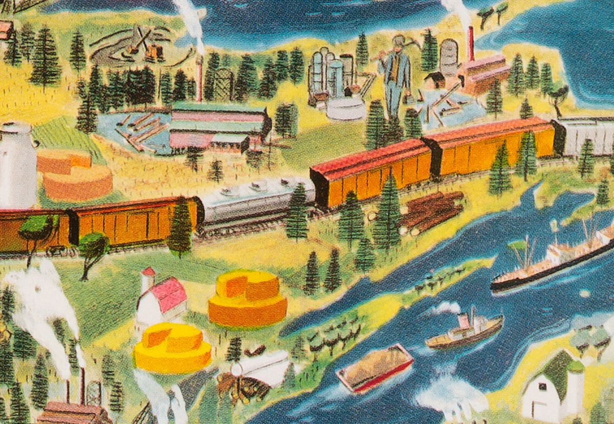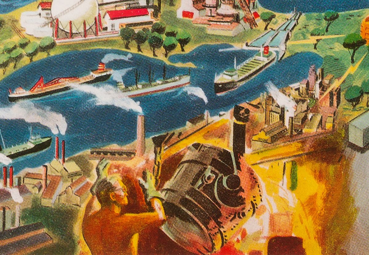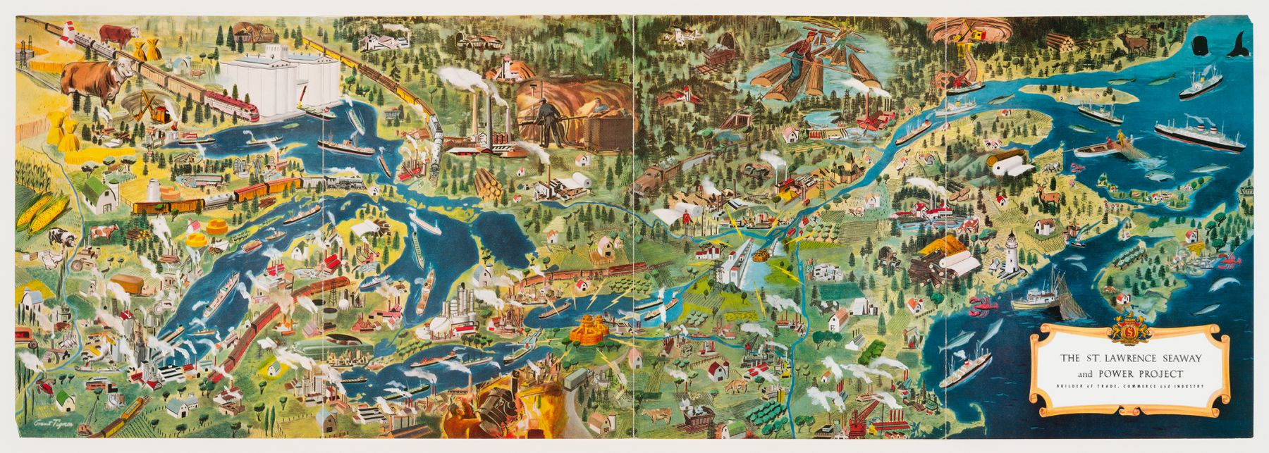In the same year, Seagrams Limited devoted its annual report to the theme of the seaway, and republished a portion of the report separately as a small booklet about the project. “We have felt that Canadian business not merely avails itself of a privilege but fulfils also a duty when it lifts its eyes from the narrow confines of its own interests,” company president Samuel Bronfman explains in the introduction. The booklet’s centrepiece is a panoramic fold-out painting by Grant Tigner, reproduced in full below.