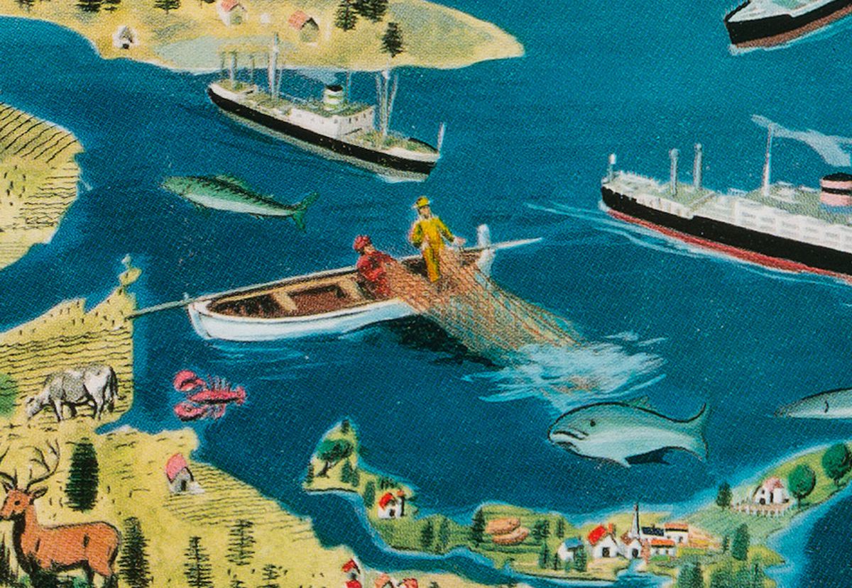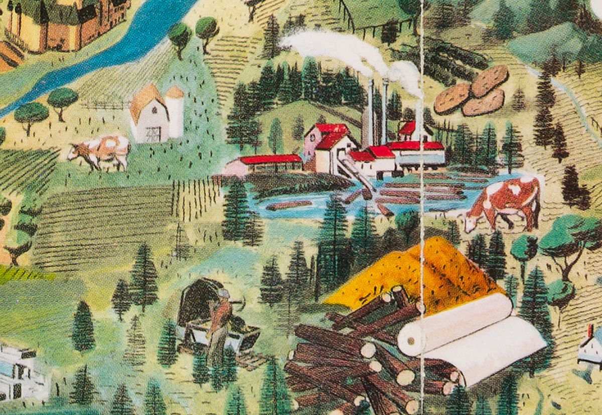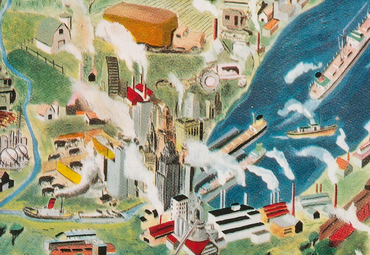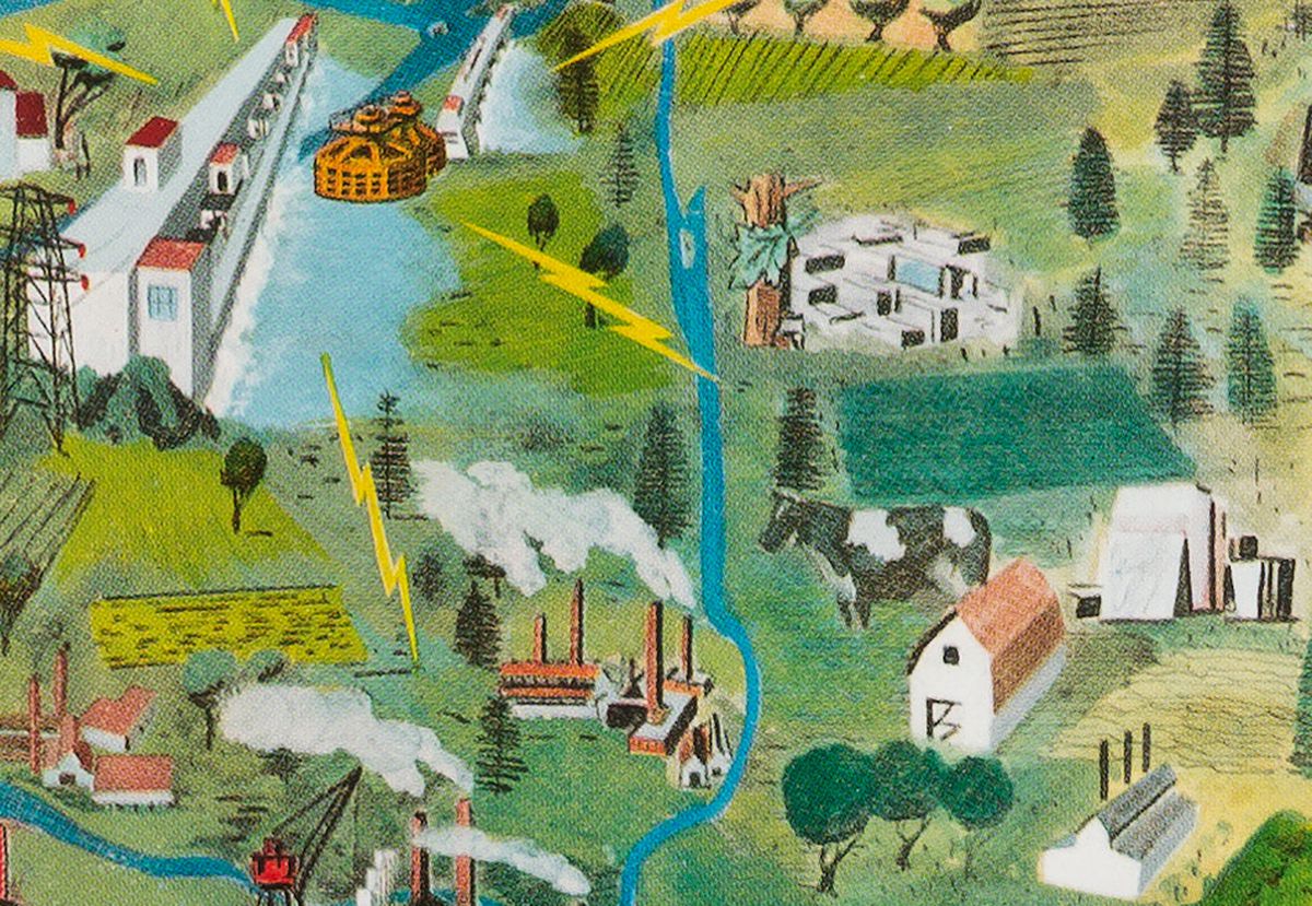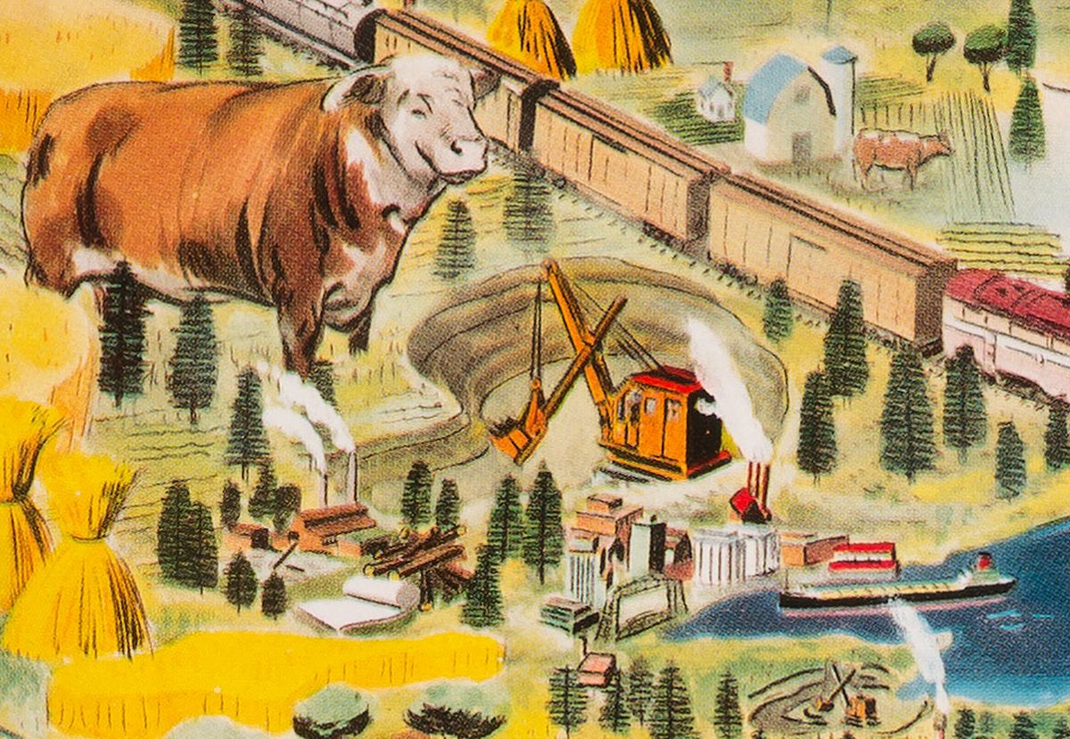 In the same year, Seagrams Limited devoted its annual report to the theme of the seaway, and republished a portion of the report separately as a small booklet about the project. “We have felt that Canadian business not merely avails itself of a privilege but fulfils also a duty when it lifts its eyes from the narrow confines of its own interests,” company president Samuel Bronfman explains in the introduction. The booklet’s centrepiece is a panoramic fold-out painting by Grant Tigner, reproduced in full below.