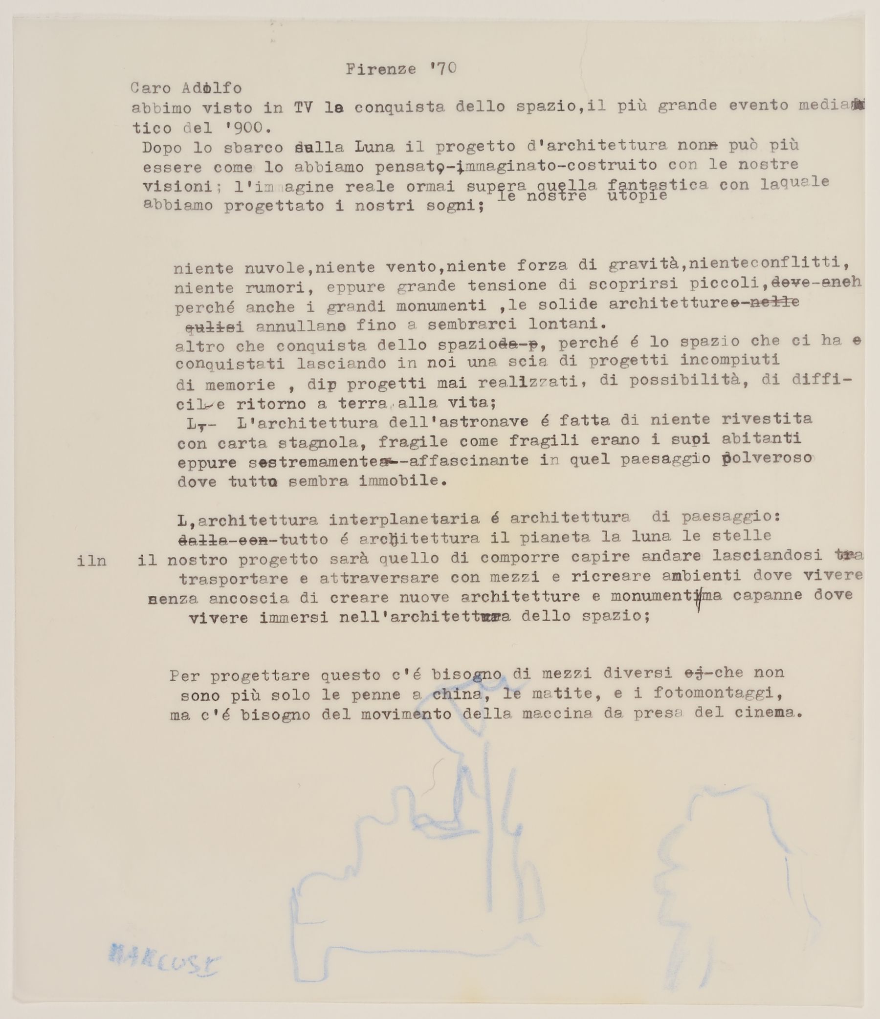 Interplanetary architecture is landscape architecture: everything is architecture the planet the moon the stars our project will be to compose to understand to let ourselves be carried away, to travel by new means and to reimagine surroundings to live in, not with the anxiety of creating new architectures and monuments, but as huts where we can live engulfed in the architecture of space;