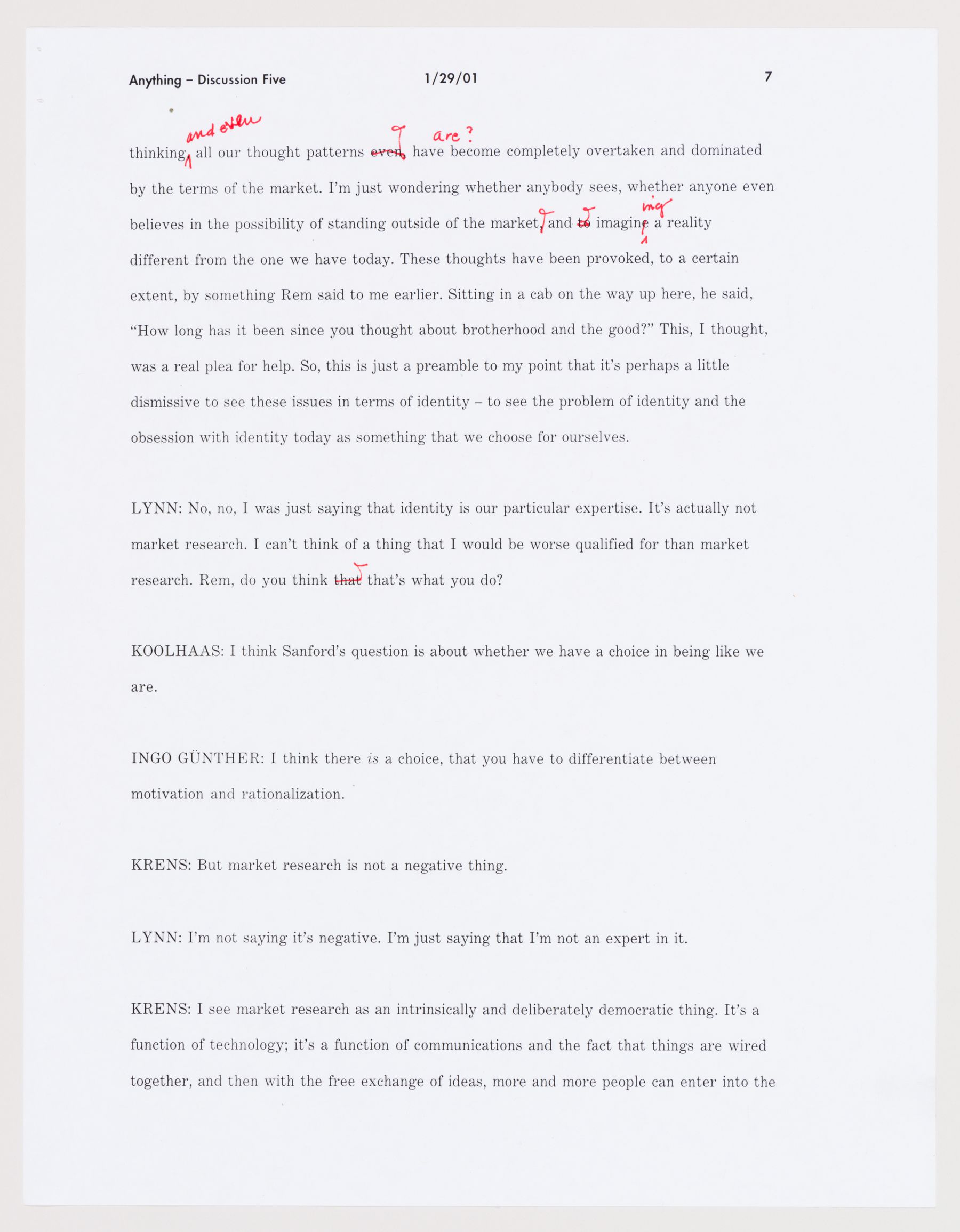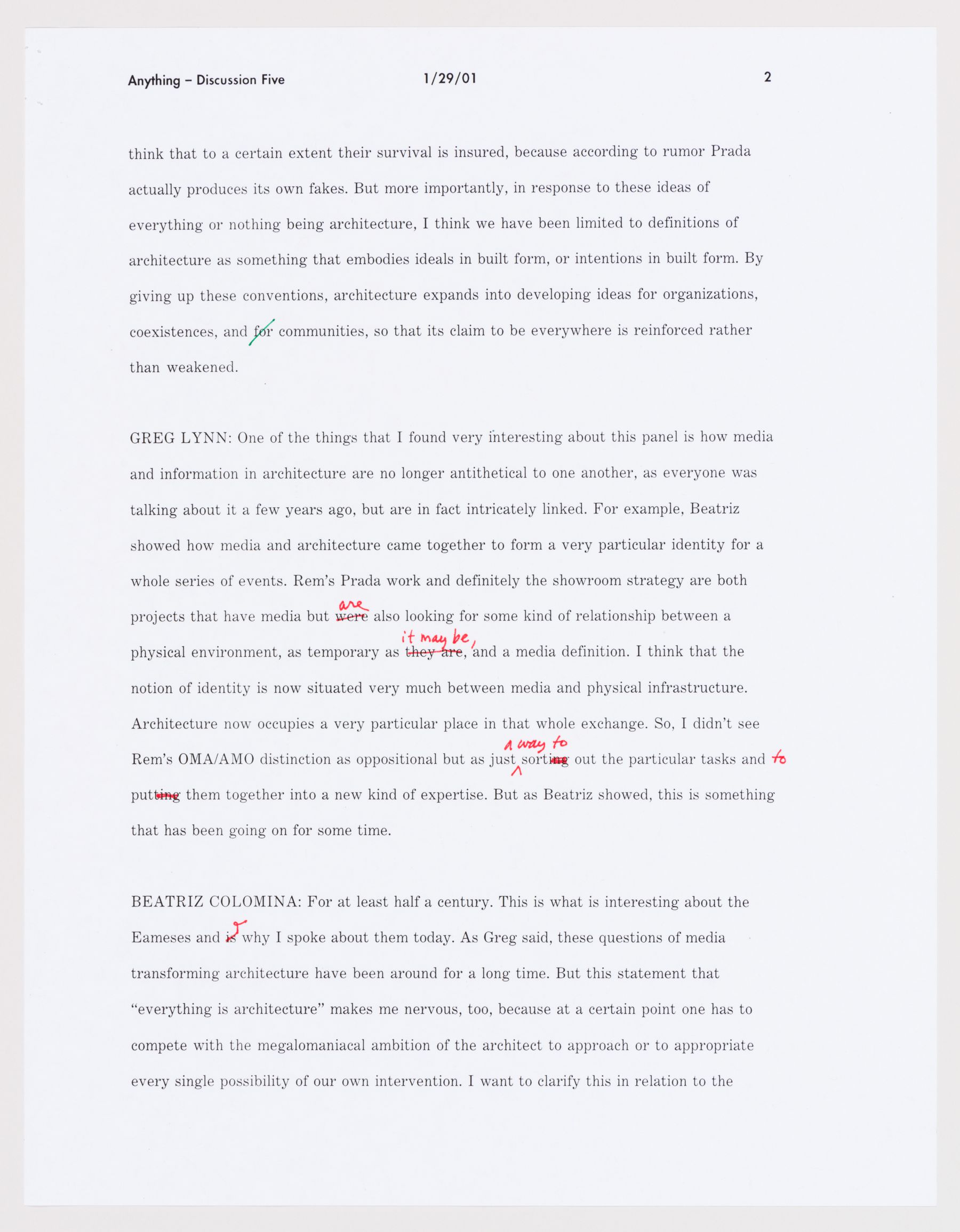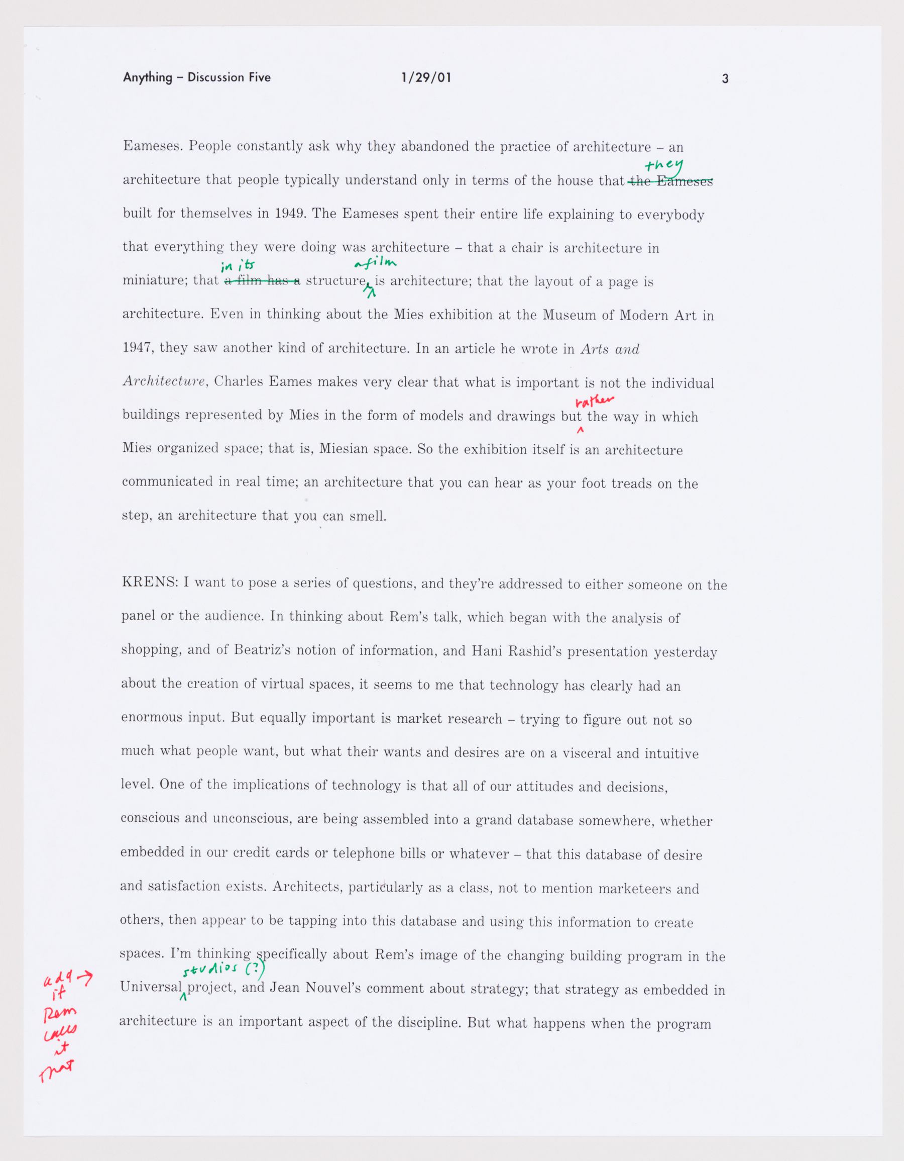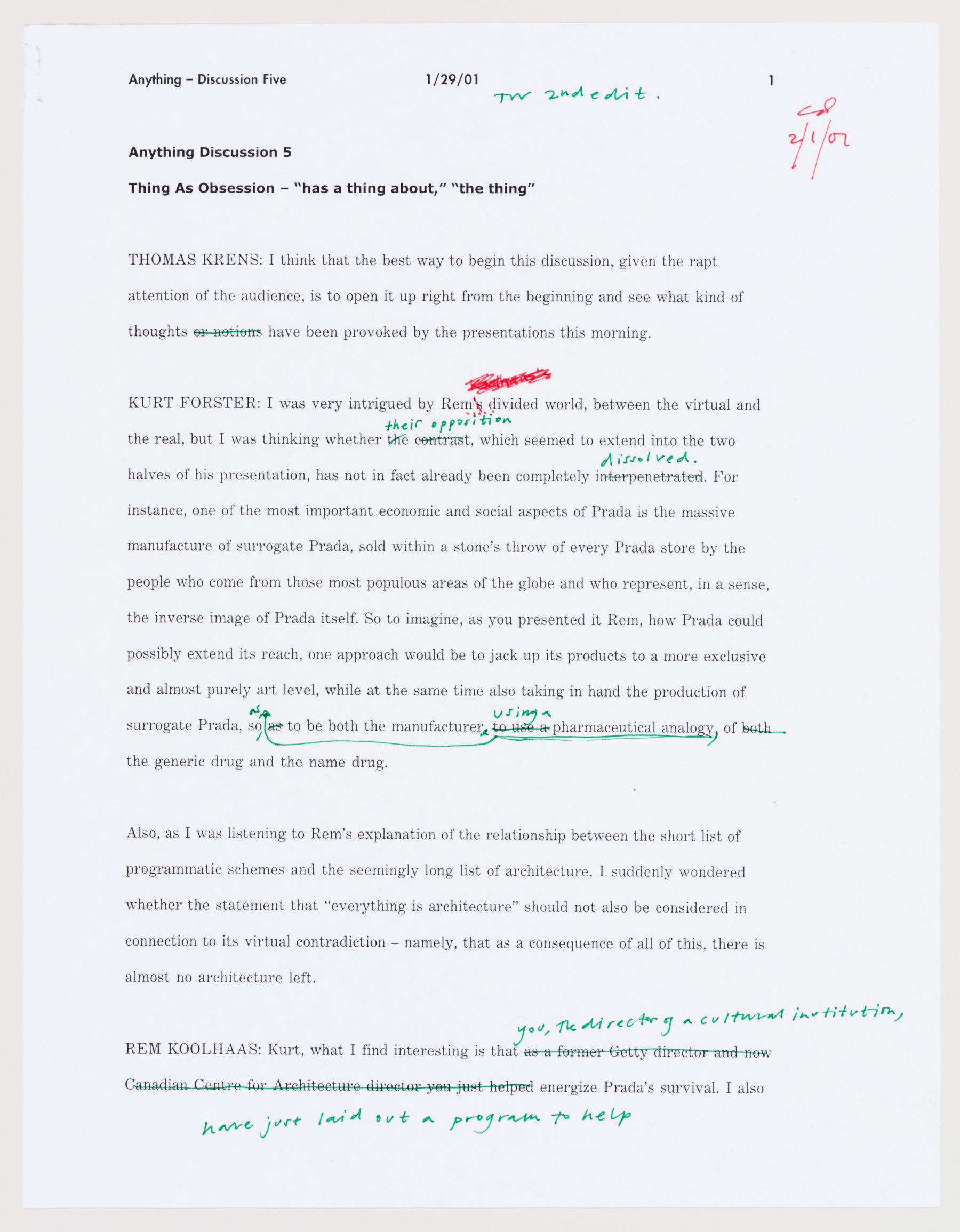The annotated transcript of “Thing As Obsession,” a panel discussion between Thomas Krens, Kurt Forster, Rem Koolhaas, Greg Lynn, Beatriz Colomina, Germano Celant, Sanford Kwinter, Ingo Günther, Phyllis Lambert, and Jean-Louis Cohen, with participation from members of the audience, on the relationship between media and architecture at the last Any conference, Anything, held at the Guggenheim Museum in New York. 29 January 2001.