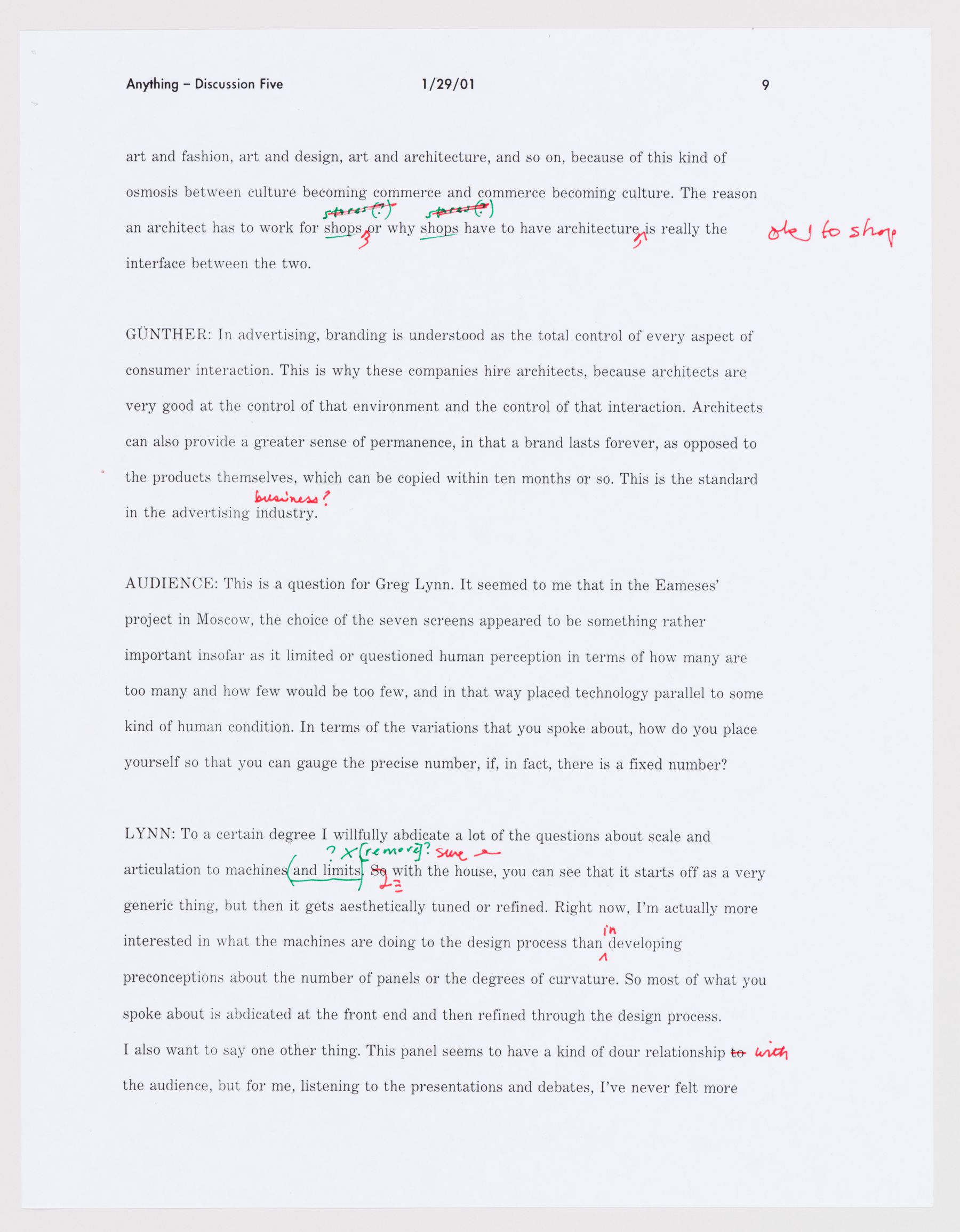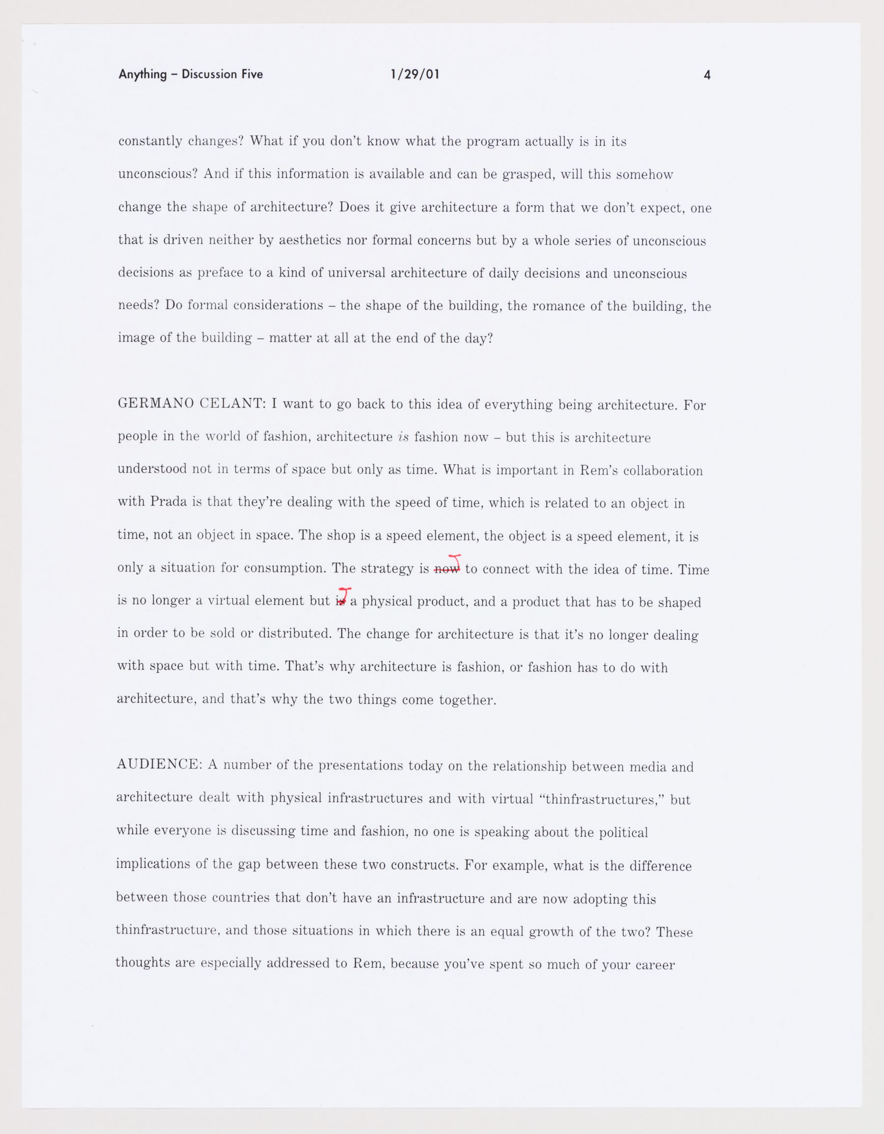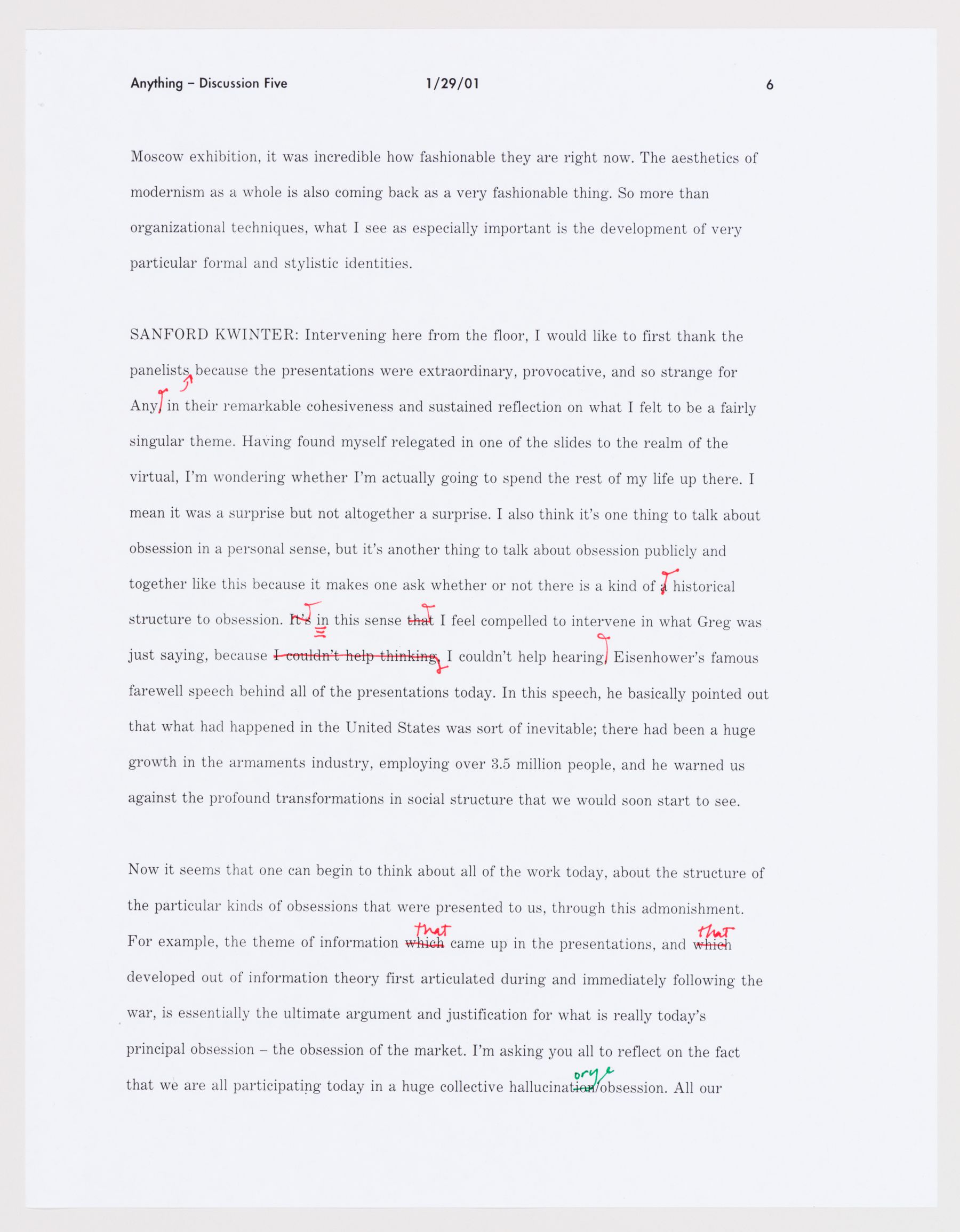 The annotated transcript of “Thing As Obsession,” a panel discussion between Thomas Krens, Kurt Forster, Rem Koolhaas, Greg Lynn, Beatriz Colomina, Germano Celant, Sanford Kwinter, Ingo Günther, Phyllis Lambert, and Jean-Louis Cohen, with participation from members of the audience, on the relationship between media and architecture at the last Any conference, Anything, held at the Guggenheim Museum in New York. 29 January 2001.