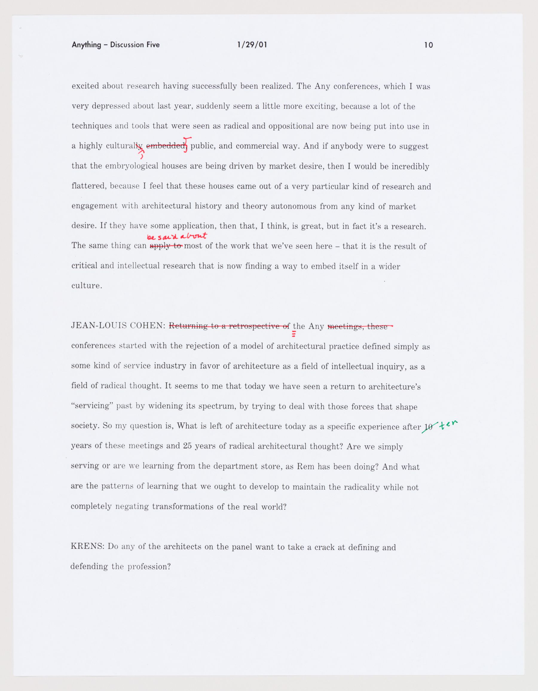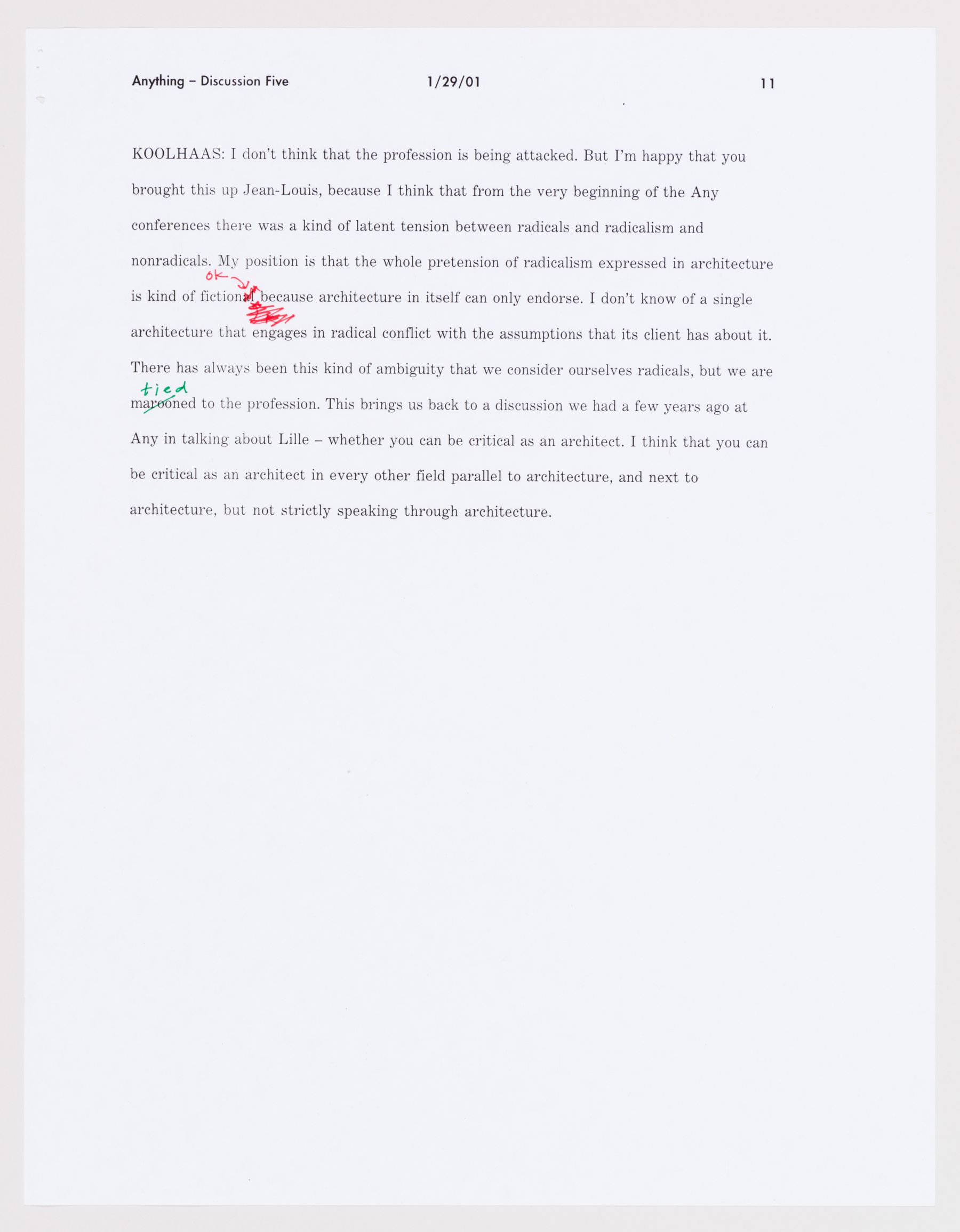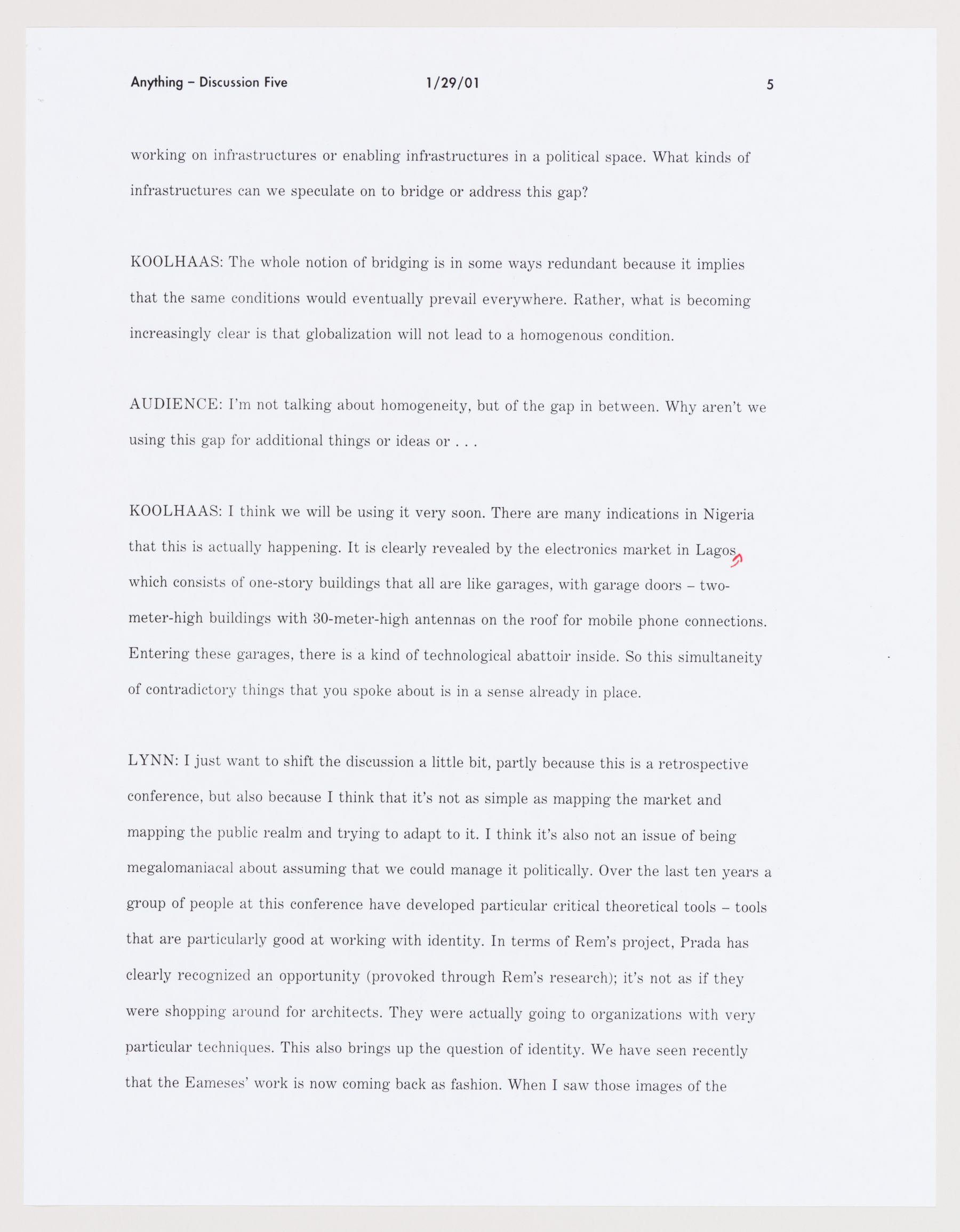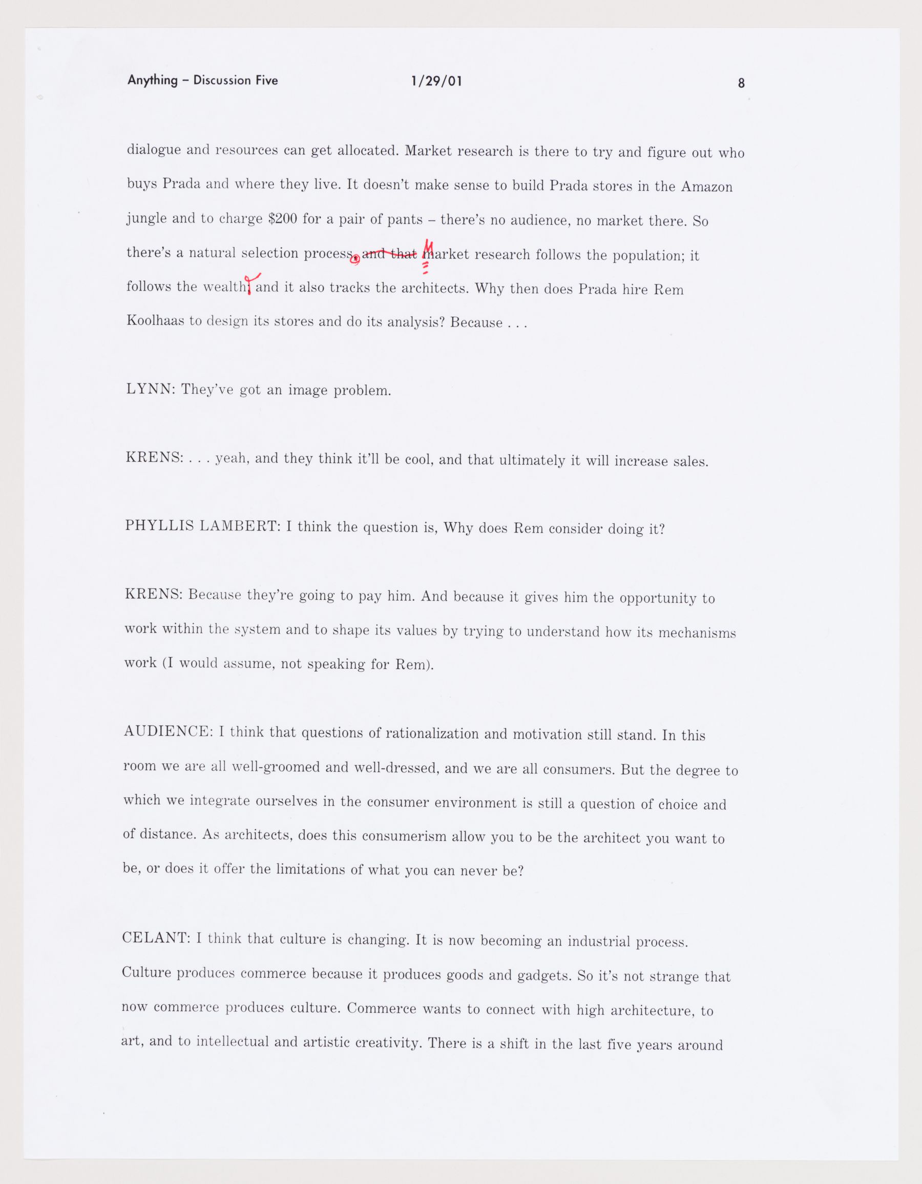The annotated transcript of “Thing As Obsession,” a panel discussion between Thomas Krens, Kurt Forster, Rem Koolhaas, Greg Lynn, Beatriz Colomina, Germano Celant, Sanford Kwinter, Ingo Günther, Phyllis Lambert, and Jean-Louis Cohen, with participation from members of the audience, on the relationship between media and architecture at the last Any conference, Anything, held at the Guggenheim Museum in New York. 29 January 2001.