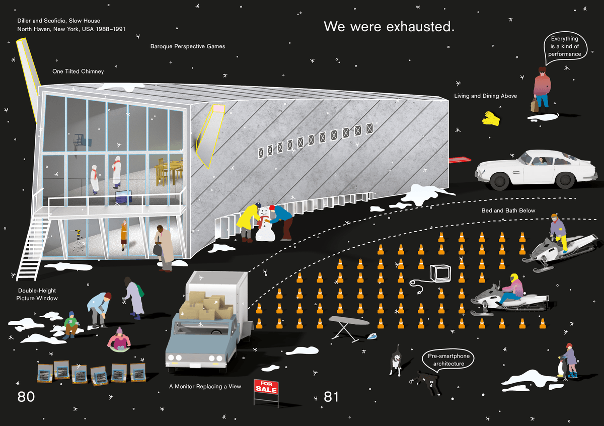 Drawing by MOS, from Houses for Sale (CCA/Corraini Edizioni, 2019), pages 2–3