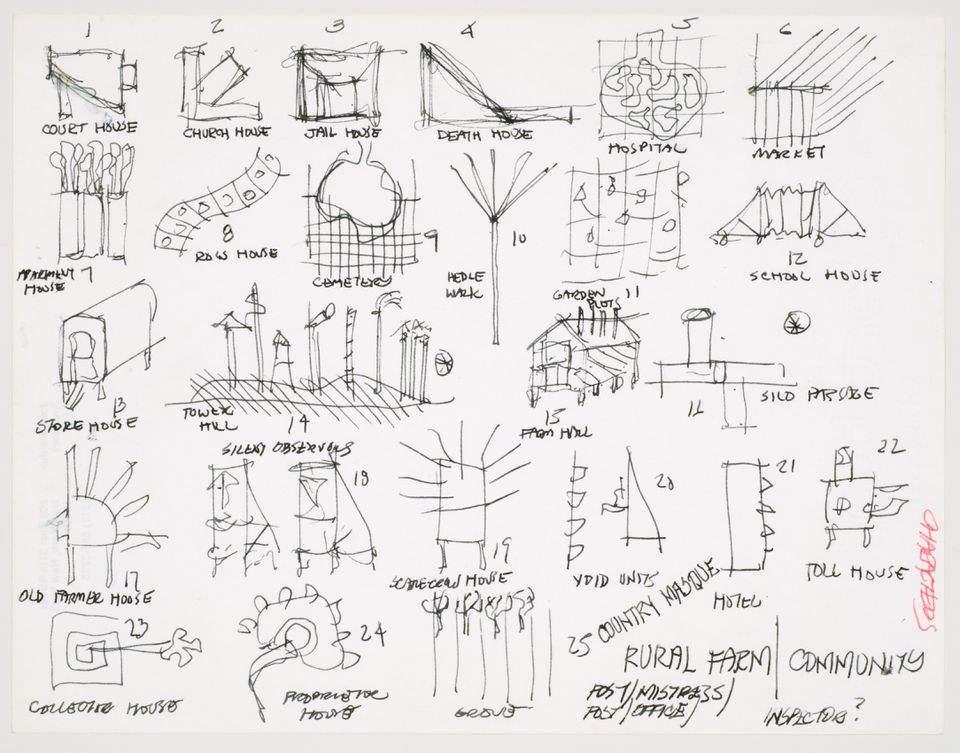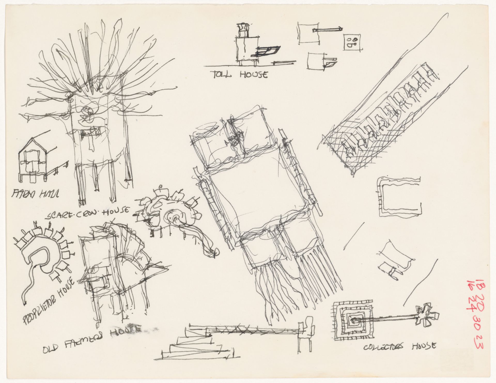 All of these drawings and collages are published and illustrated, along with Hejduk’s descriptions of the structures, in our 1992 book The Lancaster/Hanover Masque, which accompanied an exhibition by the same name.