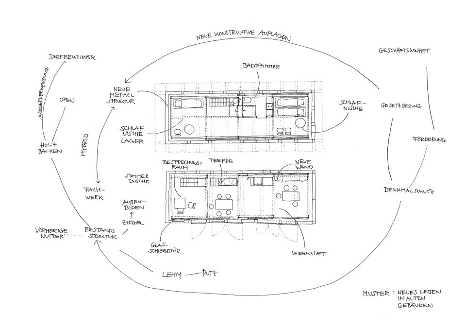Die Baufälligkeit und der Leerstand vieler Gebäude auf dem Land lässt sich wie folgt erklären: sie zu renovieren oder zu unterhalten wäre zu teuer, der in ihnen angelegte Lebensstil entspricht nicht jenen der Besitzer:innen, sie werden mit einer negativen Vergangenheit assoziiert oder es ist schlichtweg einfacher, ein neues, komfortableres Haus zu bauen. Neue im Dorf lebende Menschen, die von der Stadt herziehen, sehen in diesen Baustrukturen eine Möglichkeit, sich niederzulassen und ein neues Leben oder Unternehmen aufzubauen. Die Neuankommenden erkennen das unmittelbare Potenzial dieser häufig im Dorfzentrum stehenden Gebäude und nutzen sie für neue Programme oder Unternehmensmodelle, die sowohl eine Verbindung zum Dorf als auch zu ihrem individuellen städtischen Netzwerk herstellen. Eine ehemalige Kirche in Saint-Adrien in Kanada wird zu einem Genossenschaftsladen und Tonstudio, ein altes Theater im japanischen Kamiyama öffnet sich dem Dorf und lädt internationale Kunstschaffende zu Performances ein, eine Scheune in Gerswalde in Deutschland wird Sommerbüro und Projektraum. Mit solchen Konzepten erhalten Bewohnerinnen und Bewohner bestehende, gebaute Formen, erweitern gleichzeitig ihren Nutzen und bringen neues Leben ins Dorf.