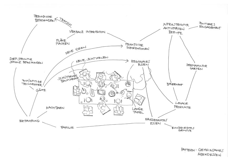 Ländliche Lebensweisen sind stärker an gemeinschaftlicher Herstellung und Verwendung von Nahrungsmitteln ausgerichtet, als dies in Städten der Fall ist. Ich habe an Abendessen teilgenommen, bei denen eine große Personengruppe während des gemeinsamen Essens zahlreiche Ideen diskutierte. Internationale Rezepte wurden mit lokalen Zutaten kombiniert. Saisonale Gemüse wurden frisch geerntet und mit regionalen Produkten kombiniert. Beispielsweise wird ein japanisches Curry mit einem Salat aus Wildpflanzen von der nahegelegenen Wiese angerichtet. Diese Versammlungen ermöglichen das unerwartete Kennenlernen anderer Personen, mit denen oft praktische Informationen über das Dorfleben ausgetauscht und gemeinsame Pläne für zukünftige Projekte geschmiedet werden.