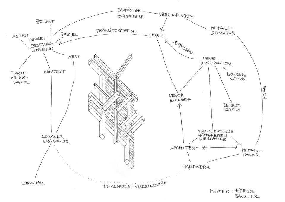 Die Umformung der Wildnis in eine Kulturlandschaft hat mit der traditionellen, alltäglichen Bewirtung von Ländereien begonnen. Gebäude zu bauen war dabei integraler Bestandteil dieser gemeinschaftlichen Unterhaltsarbeit. Nach ihrer Erbauung wurden diese häufig schrittweise erweitert. Anwohner:innen halfen dabei, teilten ihr Wissen und Material und unterstützen so ein komplexes lokales System der gegenseitigen Gabe. Heute spiegelt sich dieser Ansatz in der Art und Weise wider, wie das Leben der Gebäude von ihren Nutzer:innen erweitert wird. Häufig wird Material aus alten Gebäuden dazu verwendet, andere existierende Strukturen zu reparieren und umzunutzen. Beispielsweise nutzte ein Hausbesitzer in Gerswalde Lehm aus der Baugrube einer anderen Baustelle, um seine Innenwände zu verputzen.