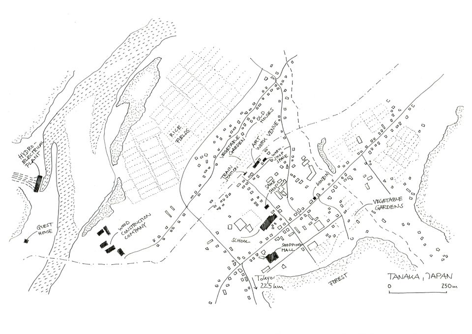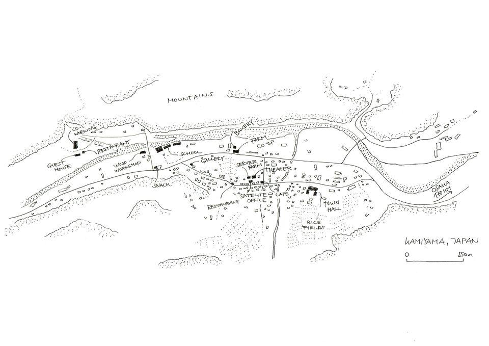 In autumn 2019, I returned to rural Japan with Jan Lindenberg, founder of the project space löwen.haus. We wanted to see if the rural developments that we had identified and mapped in rural Germany could be found in other countries around the world. Starting from Osaka, we went for a two-week trip around the Seto Inland Sea and Shikoku Island, meeting activists, architects, and initiatives that are active in the countryside. In particular, we were looking for strategies of commoning manifested in realized projects, approaches to current questions in society, and new behavioural structures within the communities that we visited. In the Japanese context, the Fukushima nuclear crisis of 2011 had prompted many to rethink their urban lifestyles and to restart in the countryside. These newcomers sought a self-sufficient lifestyle within a small community, houses built with a reduced carbon footprint that consume less energy, ways of working in close proximity, and models of living together beyond the nuclear family. Nevertheless, it was important for many to remain connected to the city. We found new rural architecture types—satellite offices, food co-ops, and remote community spaces. On Shōdo Island, a small community center is connected to another in the city, and the two exchange resources, staff, and exhibitions. A design company locates part of its office, together with its server building, in the small village of Kamiyama, allowing employees both urban and rural work settings. A food co-op in Kobe directly connects farmers with their end customers so that young farmers may start businesses outside of established networks. With us, we brought a two-sided map that explained our home context of Brandenburg and displayed the subject of our journey, the spatial connections of places and people in Japan. With this map, we were not mere travellers, but researchers investigating specific types of common activity that occur internationally.