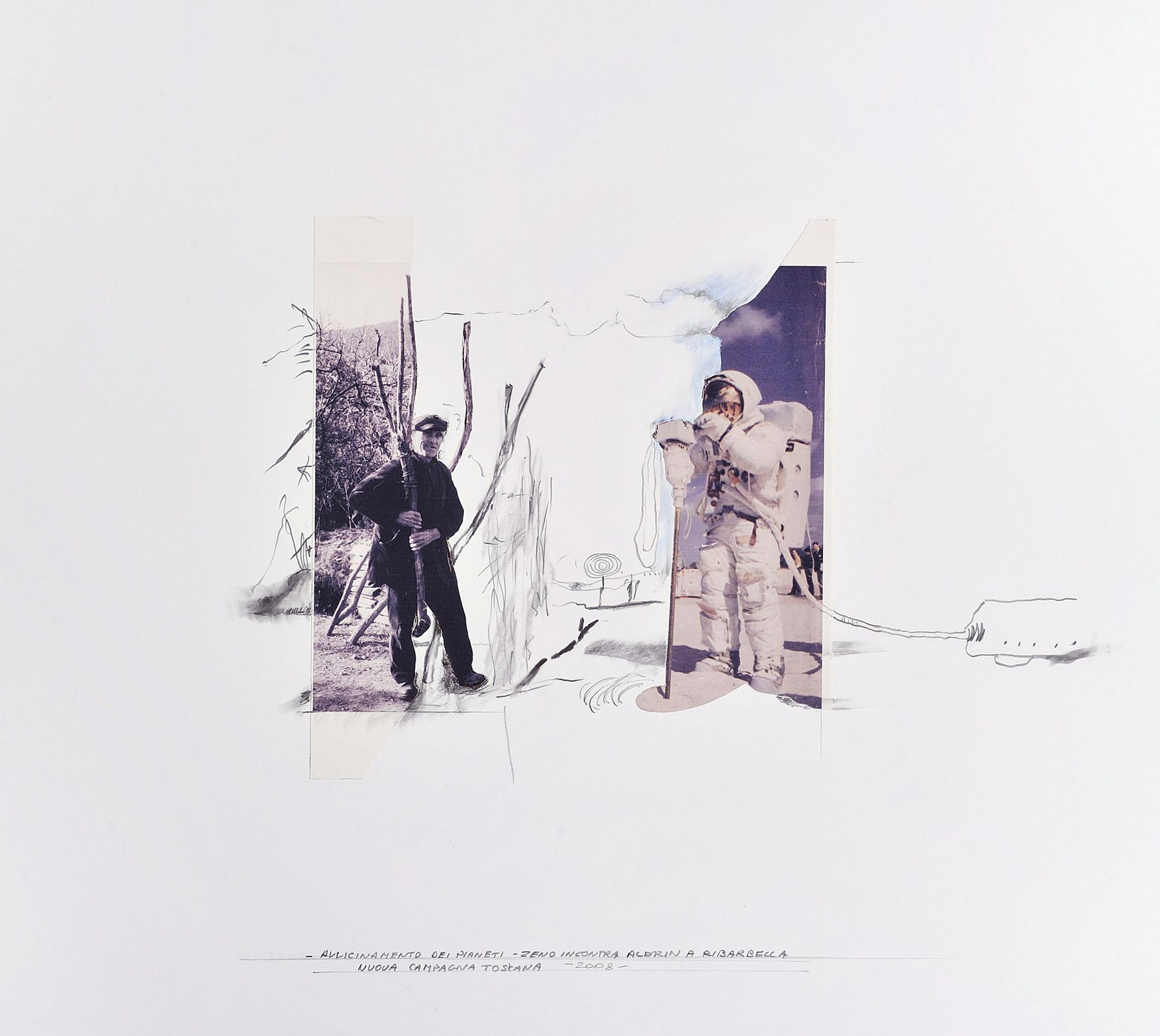 Zeno and Aldrin meet, many years after the moon landing. The landscape of Riparbella is reconstructed by their conversation as they speak. The countryside of Le Preselle—with the shed, spring and row of vines—now belongs to history. The accelerated pace of contemporary times has transformed it into a nondescript suburb.