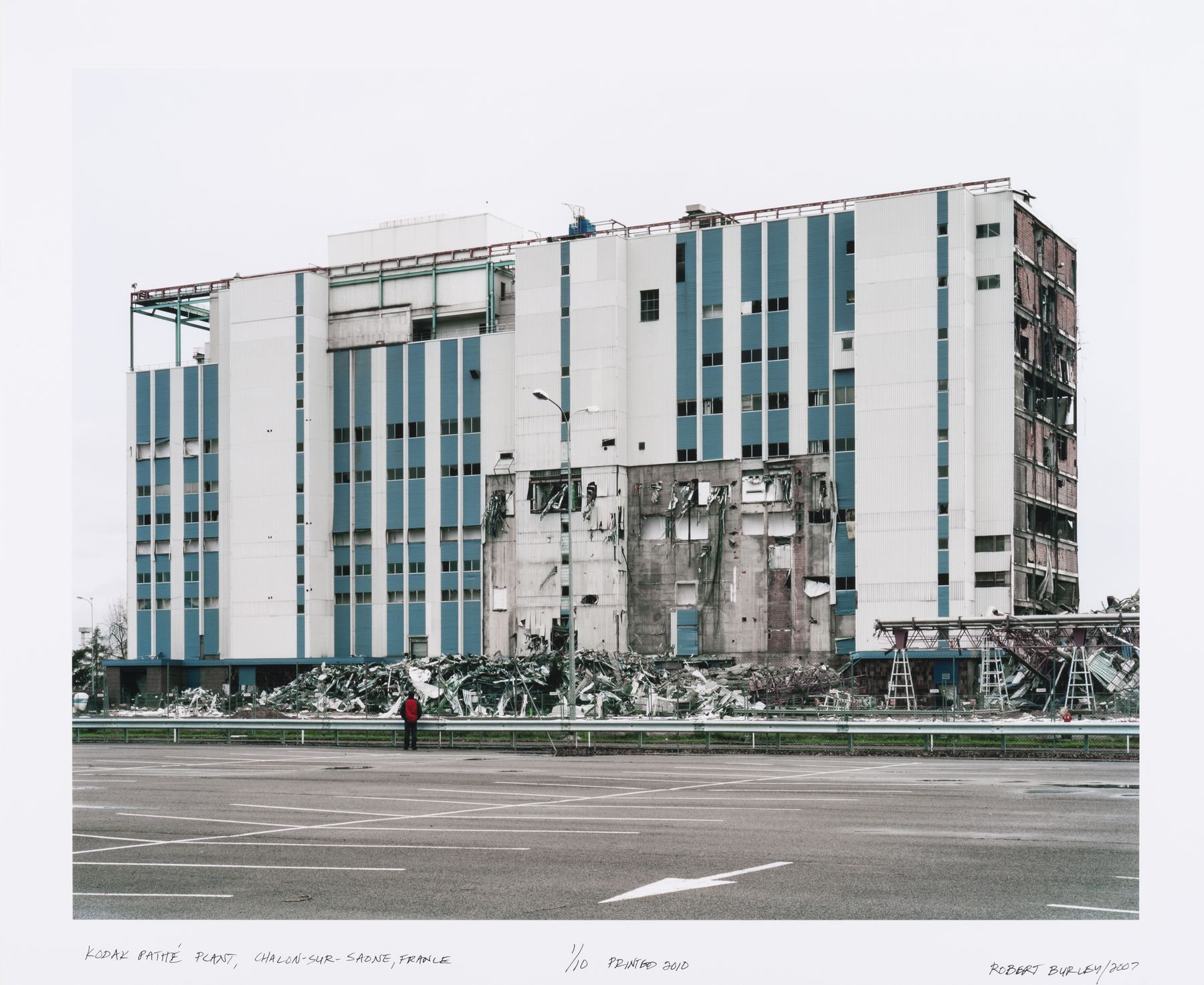 By the time I arrived at Chalon-sur-Saône, I had already attended a number of these demolitions in Rochester, New York, and become familiar with a kind of routine at these events. These implosions were always public and the deliberate destruction of these enormous factories was guaranteed to provide a rare spectacle like that of a solar eclipse or maybe a public hanging. Kodak had always been careful for some reason to put an upbeat spin on these occasions, which I found verging on the surreal. On that day, as I dutifully set up my equipment to record the significant moment on film, I was struck by how my camera was more similar than different to the one used by Niépce 180 years earlier. As the one minute warning siren sounded, indicating the demolition team was about to set off 950 kilograms of dynamite that had been carefully embedded into the structure of the building, I loaded my first film holder and I picked up my cable release. It was astounding to experience these enormous structures, most of which had manufactured film for about a hundred years, coming down in a manner of seconds. In about a six month period in 2007, Kodak carried out several of these scheduled implosions, redefining its relationship to a history it didn’t want anymore. It is remarkable how quickly they were able to rid themselves of it.
