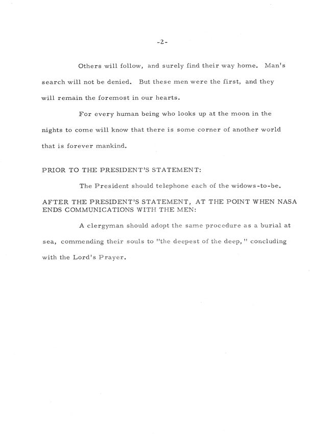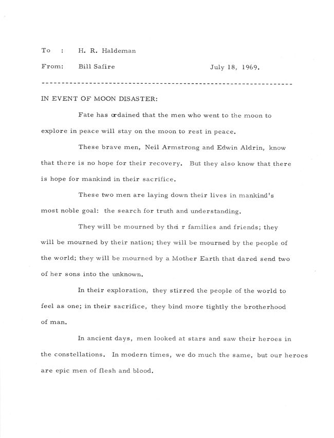 On 18 July 1969, presidential speechwriter and later political columnist William Safire drafted a memo to White House Chief of Staff H. R. Haldeman containing a speech for Richard Nixon. Intended to be read on television “in the event of moon disaster,” the President’s speech was prepared in anticipation of a catastrophe causing the death of Apollo 11 astronauts Neil Armstrong and Buzz Aldrin. The speech placed the moon mission in a broad context of human exploration and ingenuity, at once hailing the astronauts’ heroic dedication and sacrifice, and emphasizing mankind’s dominion over and beyond the earth. In addition, the memo included instructions to the President to telephone the “widows-to-be” before his address to the nation, as well as burial procedures “at the point when NASA ends communication with the men.”