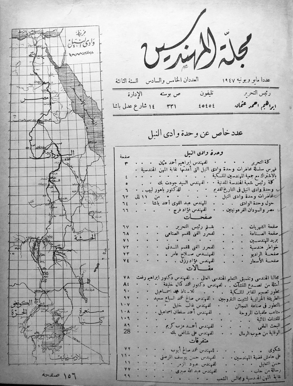 Nationalist engineers followed. Having recently been syndicated, their new bimonthly professional journal, Majallat al-Muhandisīn, became a vehicle for the brazen display of nationalism. The 1947 issue featured a series of lectures devoted to the “Unity of the Nile Valley” (fig. 4). Amid articles on joint infrastructure projects and the economic benefits of unification, they anthropomorphized the Nile. “The Valley,” they wrote, “like the human body, would weaken and deteriorate, unless all its parts work in unison.”5 Engineers compared the river to a human being, one whose obedient southern body would perish without the direction of its northern mind.6 Severing one part of the valley from the other, that is, would result in the demise of both. Like the historians, engineers argued that “the unity of the Valley is a fact imposed by Nature upon us.” Apart from “the natural, hydraulic, and economic ties,” they reasoned, the unification of Egypt and Sudan is predicated on the “inseparable bonds” of “language, religion, and blood.”7 This corporeal imagery made visible the purported interdependence of the two countries while validating undertones of racial superiority.