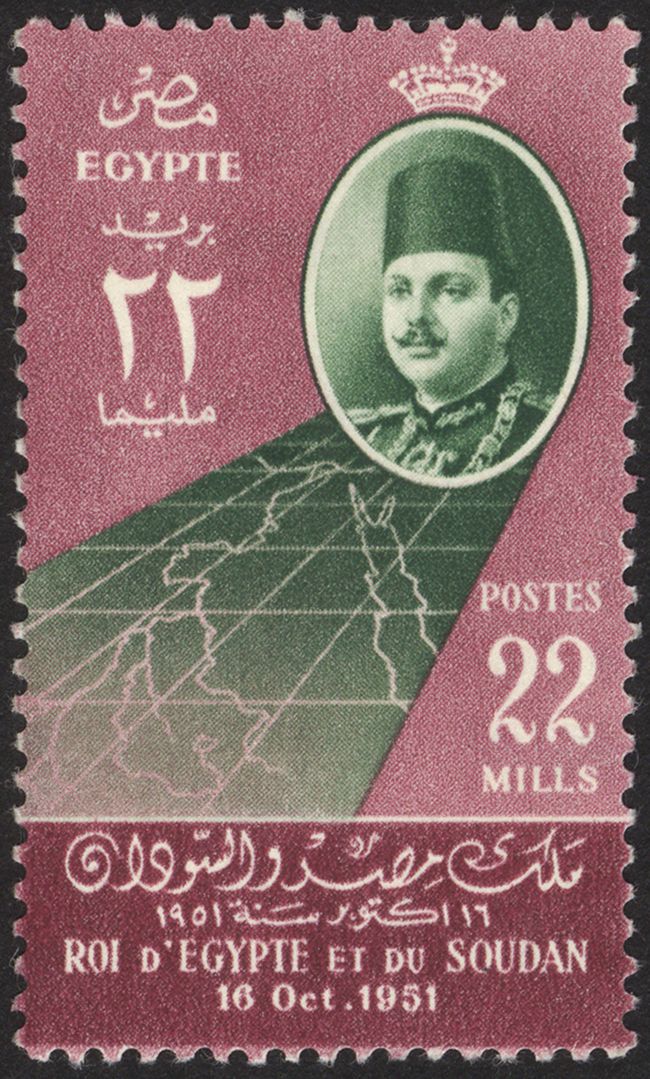 Metaphors govern. When Egypt gained nominal independence from Britain in 1922, the image of a unified Nile Valley, this time unified against the British, took over. An Anglo-Egyptian Treaty signed in 1929 recognized the “natural and historical rights of Egypt to the waters of the Nile,” and allowed Egypt to veto any upstream engineering project that would infringe on those rights. Adhering to the terms of the condominium, Britain pushed Egypt out of Sudan and retained presence in the region despite discontent on both sides. In 1951, Egypt’s King Faruq repealed the terms of the agreement and declared the two countries legally united under his rule as “The Kingdom of Egypt and Sudan.” References to the past “unity of the Nile Valley” dominated the propaganda of this move, visible in a stamp designed to commemorate the unification (fig. 3). Such images grounded sovereignty in geography.