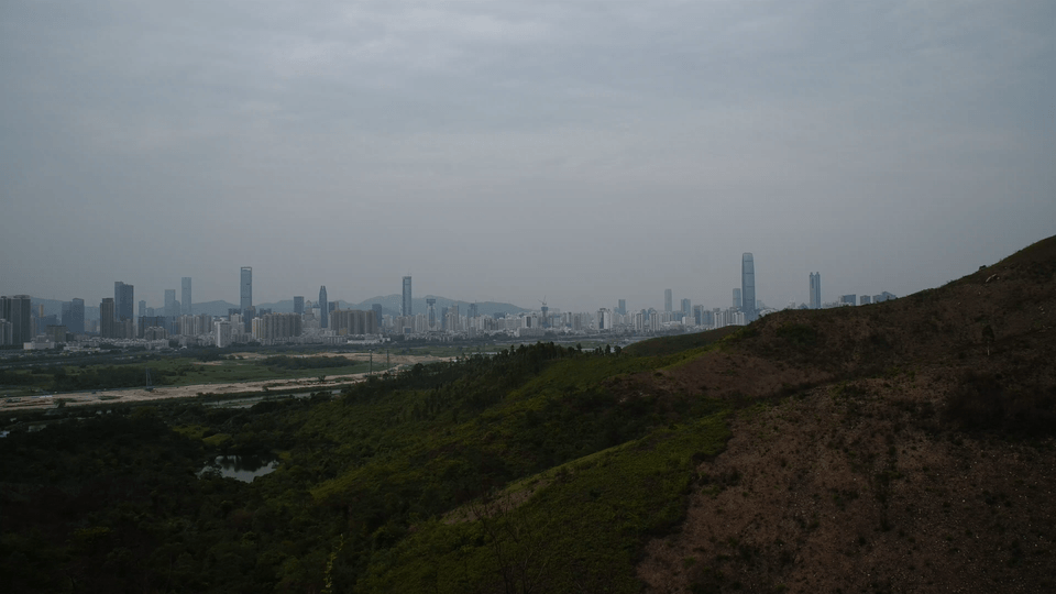 Shenzhen beyond the Sham Chun River. To the south of this frontier are fallow agricultural lands. To the north, towers in a seemingly single file along the horizon. The heaving of lorry engines and the chirping of reversing trucks signal earthworks. The early evening light hardly changes; shifts in its silver inflection sharpen angular profiles and open views into the distance. From the base of the darkening, half-charred hillside, a wavering of smoke trails obliquely from the ground.