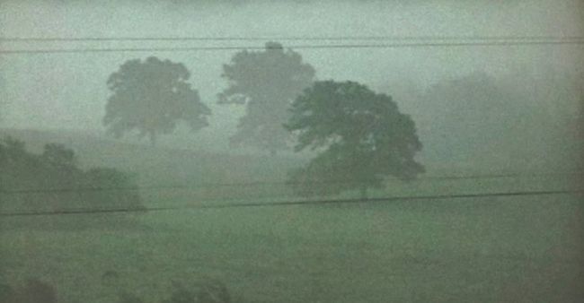 Larry Gottheim shot Fog Line (1970) outside Binghamton, New York. The film opens with a screen of even grey marked with horizontal lines and a dark splotch. This abstraction shifts and recedes to bring forth a bucolic landscape; the green of the hillside imposes itself like a chemical reaction in the atmosphere. The film scholar Scott MacDonald writes: “There are no dramatic events; there is no punch line… What ‘events’ there are are subtle, and for most first-time viewers, invisible…”1 Close attention seems to reveal two “ghost horses” underneath trees in the middle distance, their figures providing scale to what was at first unmeasurable.2 Where Warhol’s Empire maintains a cool distance, Fog Line invites the viewer to register change and gauge movement against stillness: those things that appear or are revealed against what has always been there.