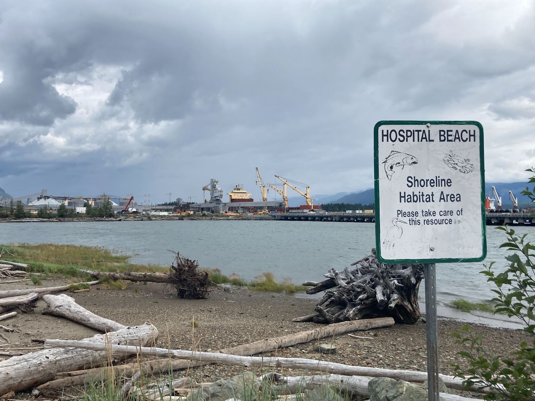 Along the western shore of the bay is Alcan Road, named after the company it services. We drove it until we reached this scene at Hospital Beach, which offers a view of the aluminum smelter and the Coastal GasLink export facility under construction. In front, a weathered sign, both informative and desperate: “please take care of this resource.” Thinking with Diamanti again, we think about this landscape as terminus, where things are transformed into other things, where materials leave behind one physical context and enter the abstract world of logistics before being transformed again at another terminal far from this one. Please take care of the shoreline habitat as its cycles of boom and bust run up against the liminality of the terminus. Please let the extractive regime finally run up against some kind of end, some kind of terminus to the purgatory between decline and promise.