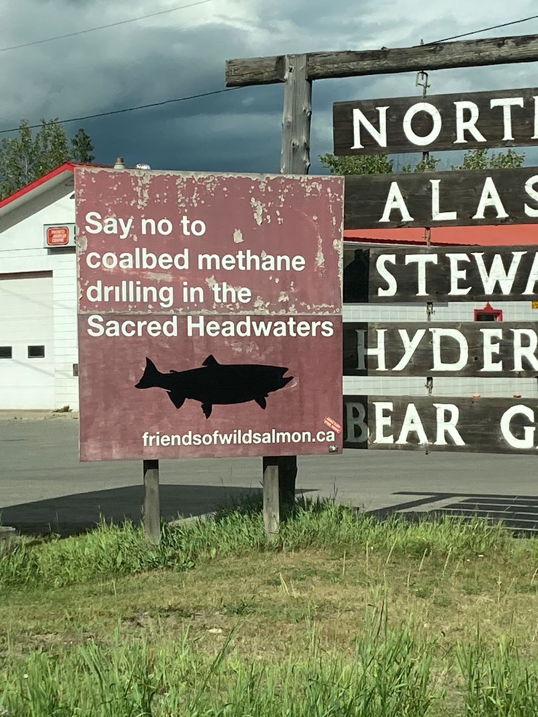 The coalbed methane sign is a few years old: the plywood surface the sign of is visible through chipped paint. That there are friends of wild salmon suggests the recognition of a symbiotic relationship. You keep reproducing and being caught, and we make sure your rivers and oceans are livable. But this “we” is particular. The Skeena, Nass, and Stikine Rivers all flow from the Sacred Headwaters in a watershed that is of critical importance to the Tahltan Nation.1 Being so close to where Wet’suwet’en land defenders continue to block the Coastal Gaslink pipeline, we stop to consider, thinking with Anne Spice, that perhaps this is what “critical infrastructure” really means: not just pipelines and refineries but the ecologies and lifeforms that sustain lives, livelihoods, and ways of living.2 The argument against drilling is the Indigenous right to fish and to live. In this case, drilling has stopped, and protections have been put in place.3 Does this victory mean it is time to take the sign down? Or should it be left up as a reminder that this site marks contested ground?