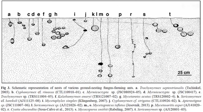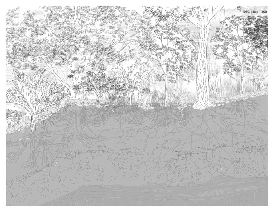 Interwoven with xiguyre‘s tunnels are those of leafcutter ants. Experts in building chambers for growing fungus, their main food source, leafcutter ants maintain complex underground networks for mobility and food supply. Their tunnels collaborate with the growth of plants, making the soil more penetrable by roots. Leafcutter ants find most of their food in the litterfall, a ten-centimetre-thick layer on Nhe’ery‘s topsoil. The litterfall assembles a deep ecosystem, with microbial lives, leaves, branches, and barks, decomposing and fabricating humus. More than one million beings inhabit one square metre of ten-centimetre-deep litterfall. Xiguyre and leafcutter ant tunnels are two among thousands of Nhe’ery‘s ground-underground infrastructural webs.