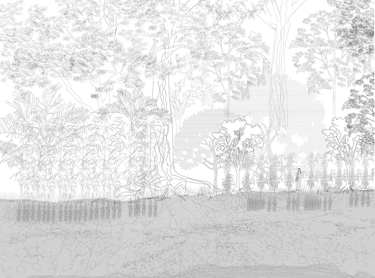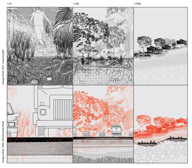How many spatial perspectives and cosmologies are left as blind spots in architecture and urban planning practices when considering only juruá standards? As DERSA’s report from Rodovia dos Bandeirantes construction has shown, creating an architectural drawing implies choosing what to depict, and what to erase. When architects, urban planners, and engineers erased the presence of the Atlantic Forest from “technical drawings”—sections, plans, and perspectives—in order to build the Rodovia dos Bandeirantes, they also designed the dispossession of Guarani and other-than-human lives, lands, and infrastructures. Architectural drawings design not only the static form of a building, but also several layers of relations: labour on the construction site, earth removal, transportation of materials, sewage and electricity connections, maintenance requirements. A line in a plan is physically situated in specific territories where complex relations between bodies, cultures, affects, and political interests keep co-existing and colliding. If architectural drawings also serve to negotiate the maintenance of lives and territorial relations with a stack of agents (public and private interests, zoning laws, and court decisions), how can architectural documents uphold the maintenance of the Atlantic Forest, Guarani land rights, and multispecies care?