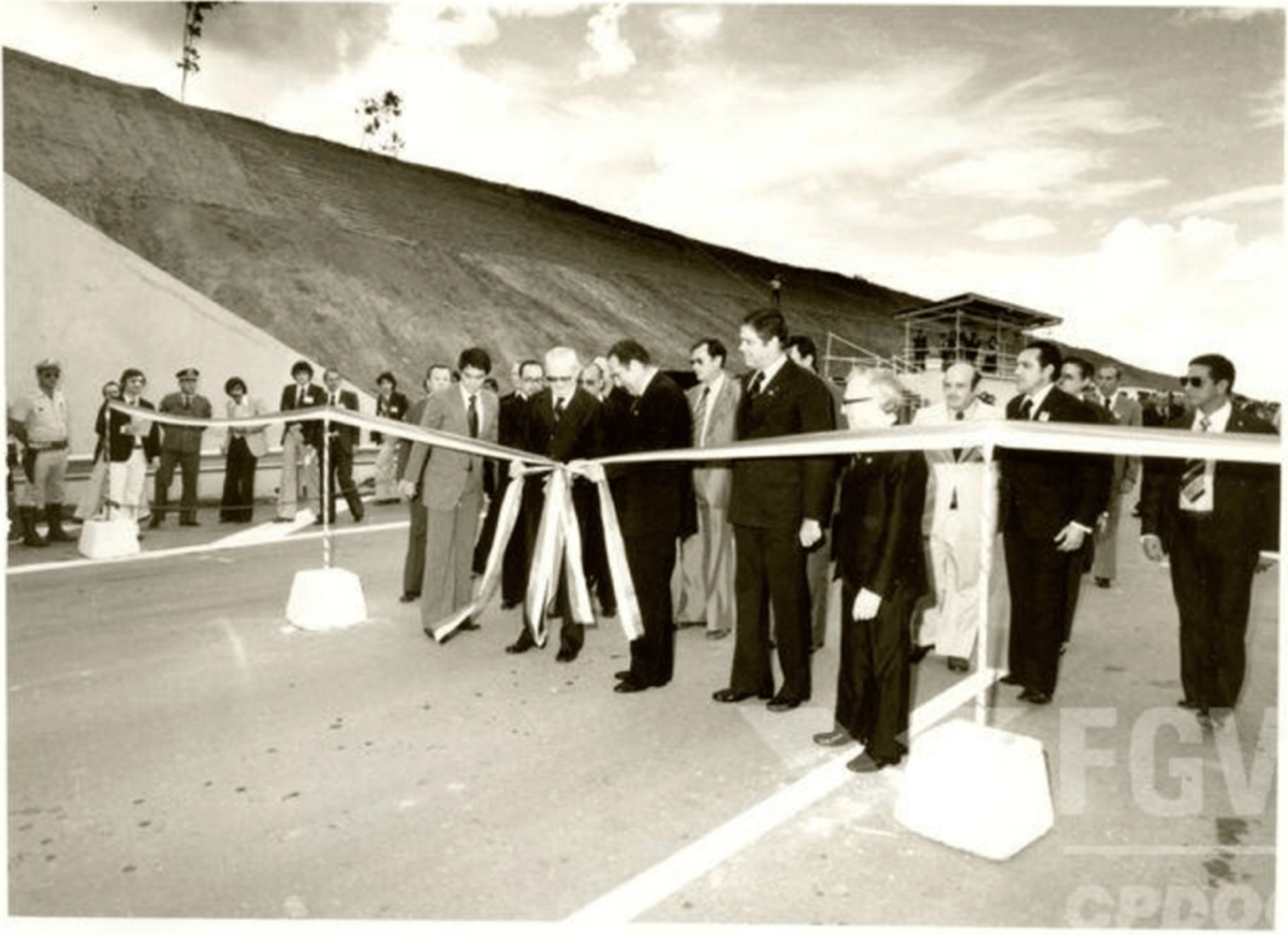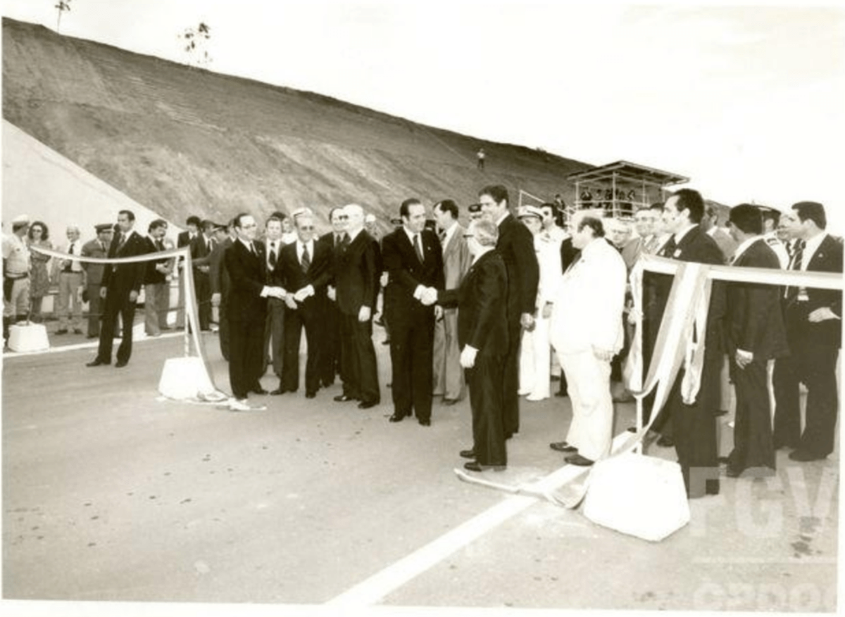 Inaugurated on 28 October 1978, the Rodovia dos Bandeirantes opened for traffic in the middle of the Brazilian military dictatorship, with two roadways, six lanes for traffic, and a capacity for seventy thousand vehicles per day. Precisely nine hours after construction concluded, then-Brazilian president Ernesto Geisel and his successor João Batista Figueiredo travelled for three hours along the 88.46 kilometre road, symbolically activating it for public use.1 DERSA (Desenvolvimento Rodoviário S/A), the public company responsible for the road construction, distributed 2,200 invitations for the inauguration. The event culminated at the Obelisco Diamante dos Bandeirantes—a forty-metre-high concrete tower—where, accompanied by the São Paulo orchestra, Geisel untied the ribbon to officially open the Rodovia dos Bandeirantes for car traffic.2