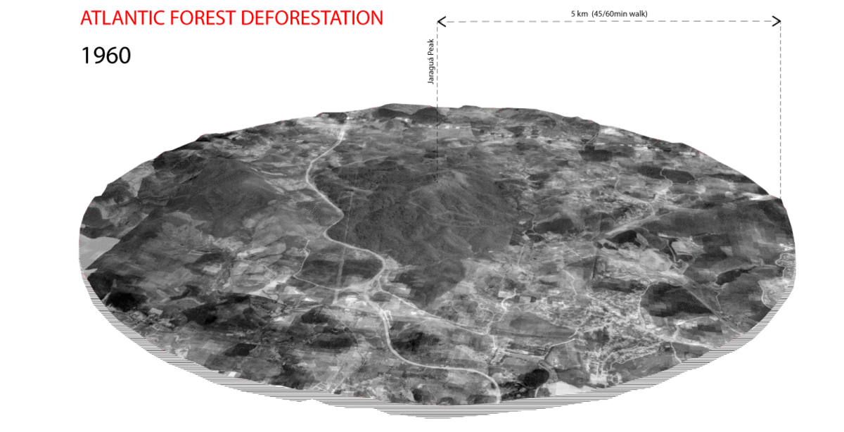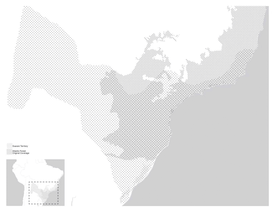 This essay is centered on Guarani territory, in Jaraguá Peak. It honors the past, present, and future relationships between the Guarani nation and their lands. The essay was written by a juruá (of non-Indigenous, settler origin) born and raised in Guarani territory, in the region today known as São Paulo, living and learning in what is now called Brazil—a nation-state that occupied and dispossessed Guarani Mbya and hundreds of other Indigenous nations’ territories. As an architect from São Paulo, I carry many preconceptions that limit comprehending the spatial and cosmological complexities and meanings of the Guarani territory, which means this essay also faces limits in translation. Part of my unlearning as an architect is also my responsibility to respect Guarani protocols and self-determination on their lands.