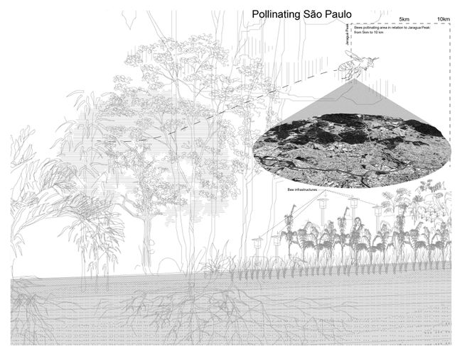 This essay has advocated for urban planners and architects to learn from multispecies infrastructures. Each forest inhabitant holds their own set of thick relations. The entanglements of human-bee interactions as stewarded by the Guarani communities in Jaraguá, the tunnels dug by armadillos, and the fungi chambers built by leafcutter ants are a few spatial practices that can provide clues as to how architects and urban planners can design alongside ongoing collaborative infrastructures—infrastructures of making with.1 If, as Brazilian president Washington Luís said, “to govern is to open roads,” what other governments could take place if multispecies roads were at the centre of infrastructure and urban planning practices? If roads are axes of influence on the city that will grow around it, what other cities could be built around multispecies roads? No infrastructure is built, maintained, or functions without day-to-day collaboration. Complicating the boundaries of terms such as “road” and “infrastructure” opens space for roads to exist beyond automotive monocultures, as collaborative infrastructures of care.