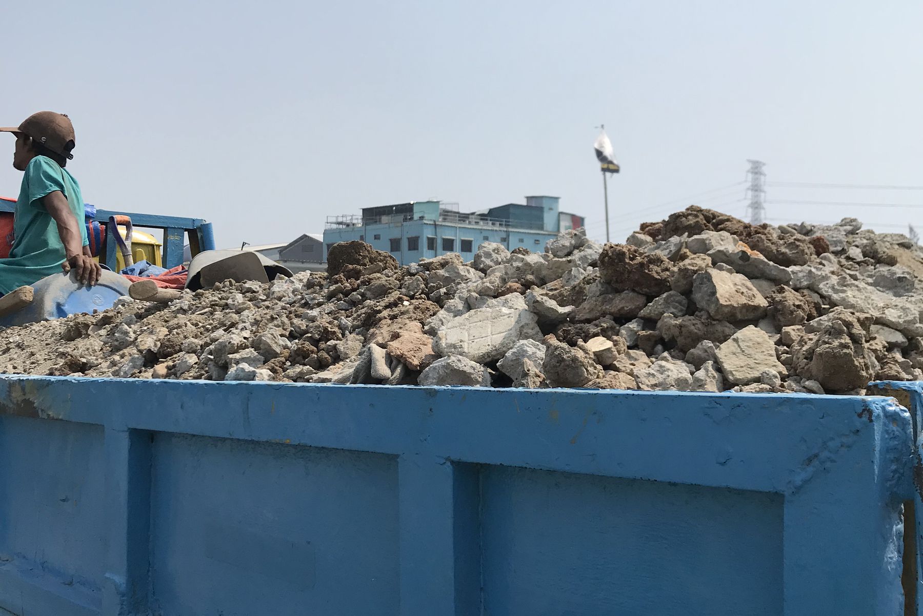 Muara Angke was once a mangrove estuary. Around 1970, migrant fisherfolk from North Java began settling the area through an incremental practice of filling in the swampy, unstable land using various available materials like rubble. Still today, construction waste trucked in from other parts of the city is used to add hard substance to various ground conditions throughout the kampung. We witnessed rubble lining and filling in roads (Figure 5), freshly laid onto pathways (Figure 6), packed around people’s homes for reinforcement and to slow the effects of subsidence, and used as a way to claim land ownership (Figure 7). Seen in Figure 8, the rubble is typically trucked from the city in vast quantities, a waste product of rapid urban development in Jakarta. Expensive to properly dispose of for the developers, the waste is therefore cheaply sold to coastal kampungs as a mutually advantageous solution.