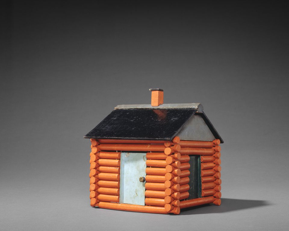The Log Cabin Play-House commemorates one of the United States’ most powerful architectural icons, the humble log cabin in which Abraham Lincoln was born. During the 1860s, especially after Lincoln’s assassination, the rustic cabin took America’s popular imagery by storm, saturating advertising, art, and children’s books. Joel Ellis was a Vermont manufacturer of toy wagons and carriages who began making the log cabin in 1862, just after the start of the Civil War. His notched logs, joined at the corners, make the walls of the house, and gaps are left for the painted-tinplate window shutters and door. Here is the forerunner of John Lloyd Wright’s famous Lincoln Logs of 1917, which improved on Ellis’s rather crude toy by dispensing with the concealed wires that held the blocks in place.