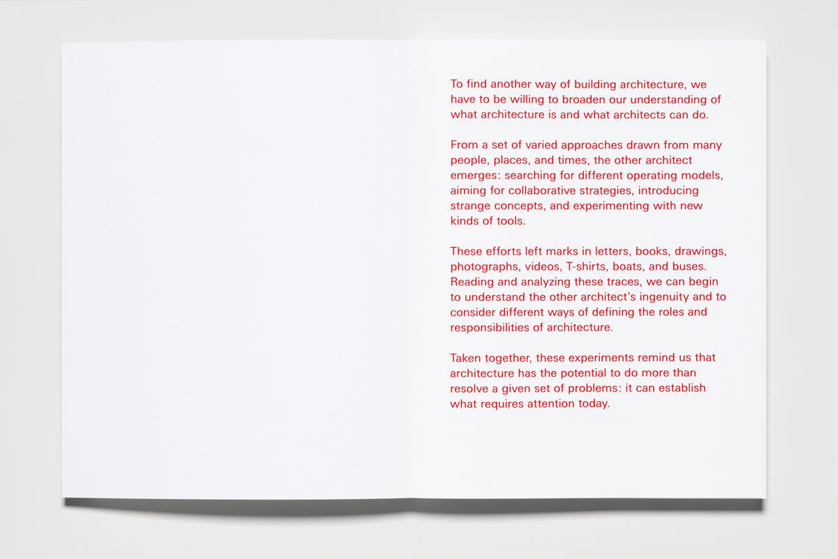 Conceived as an annotated collection of primary documents, The Other Architect presents evidence of experimental venues, methods, and tools that architects have used to research and shape the urgent issues of their time. Together, they reveal how architects can construct a cultural agenda without the intervention of built form: by establishing what requires attention today.
